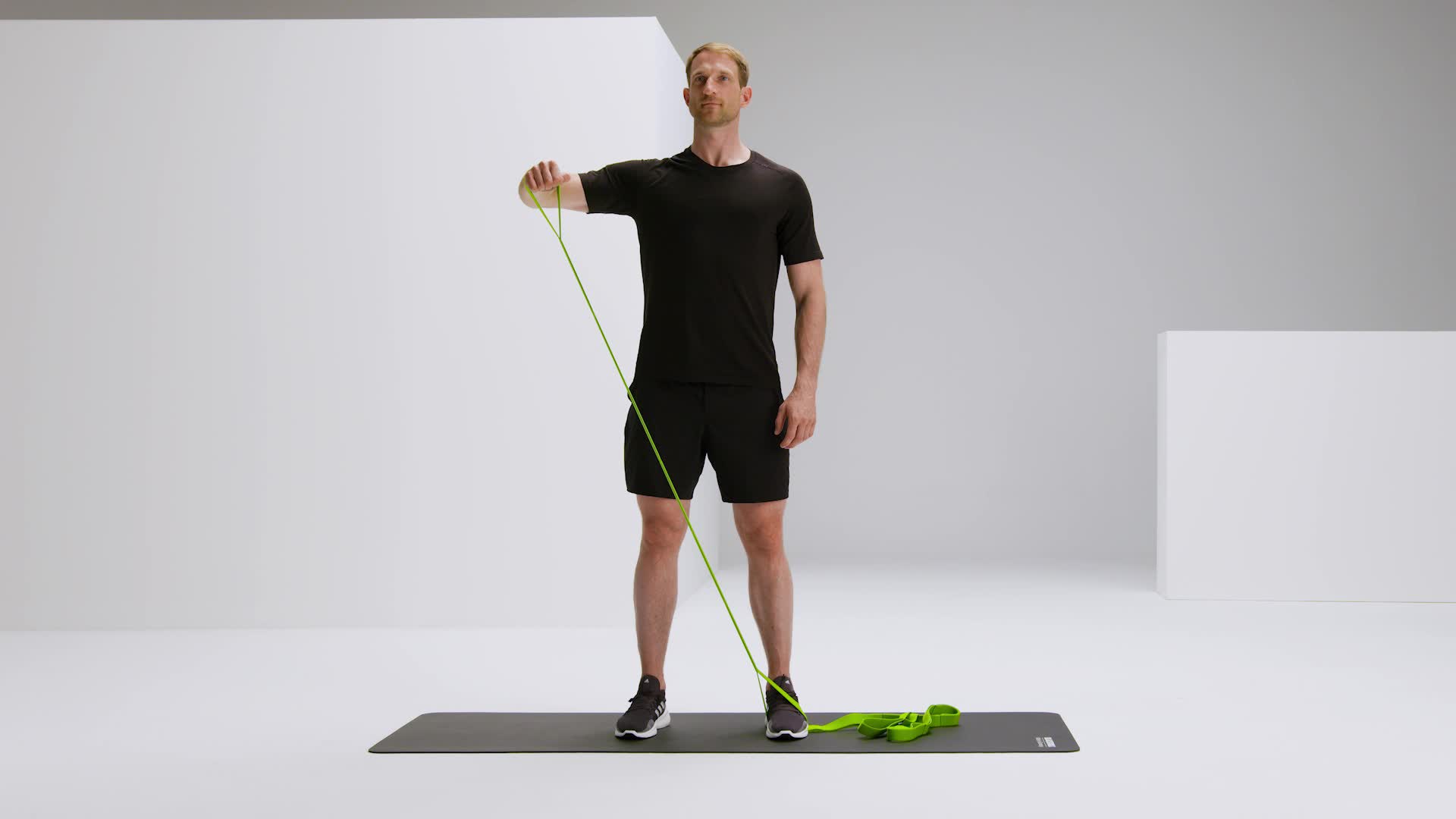 Steige mit dem Fuß in eine Schlaufe des MULTI BANDS. Greife das andere Ende mit der diogonal gegenüberliegenden Hand. Hebe den Arm 90 Grad an. Winkle den Ellenbogen an, sodass die Hand nach vorne zeigt. Führe die Hand über eine Außenrotation nach oben. Komme wieder in die Außgangsposition zurück.