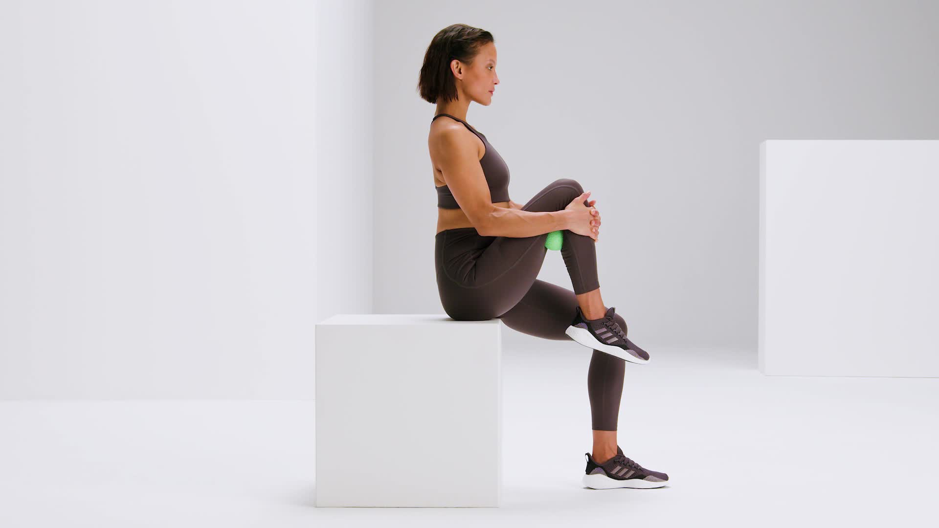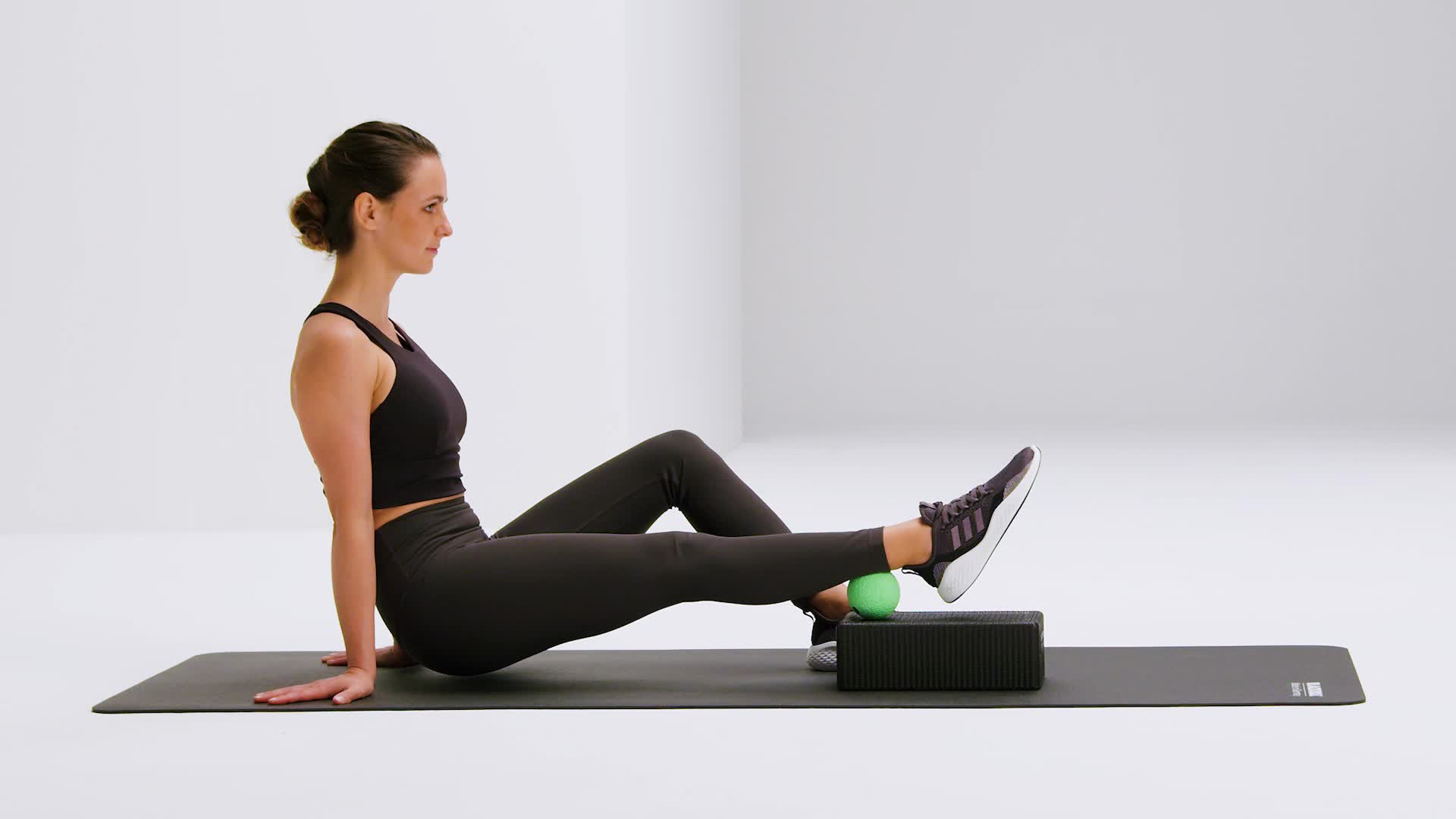 Winkel im Sitzen ein Bein. Platziere die Wade des gestreckten Beins auf dem BALL 08 und dem BLOCK. Stütze dich mit den Armen hinter deinem Körper ab. Hebe dein Gesäß vom Boden ab. Rolle deine Wade zügig aus.