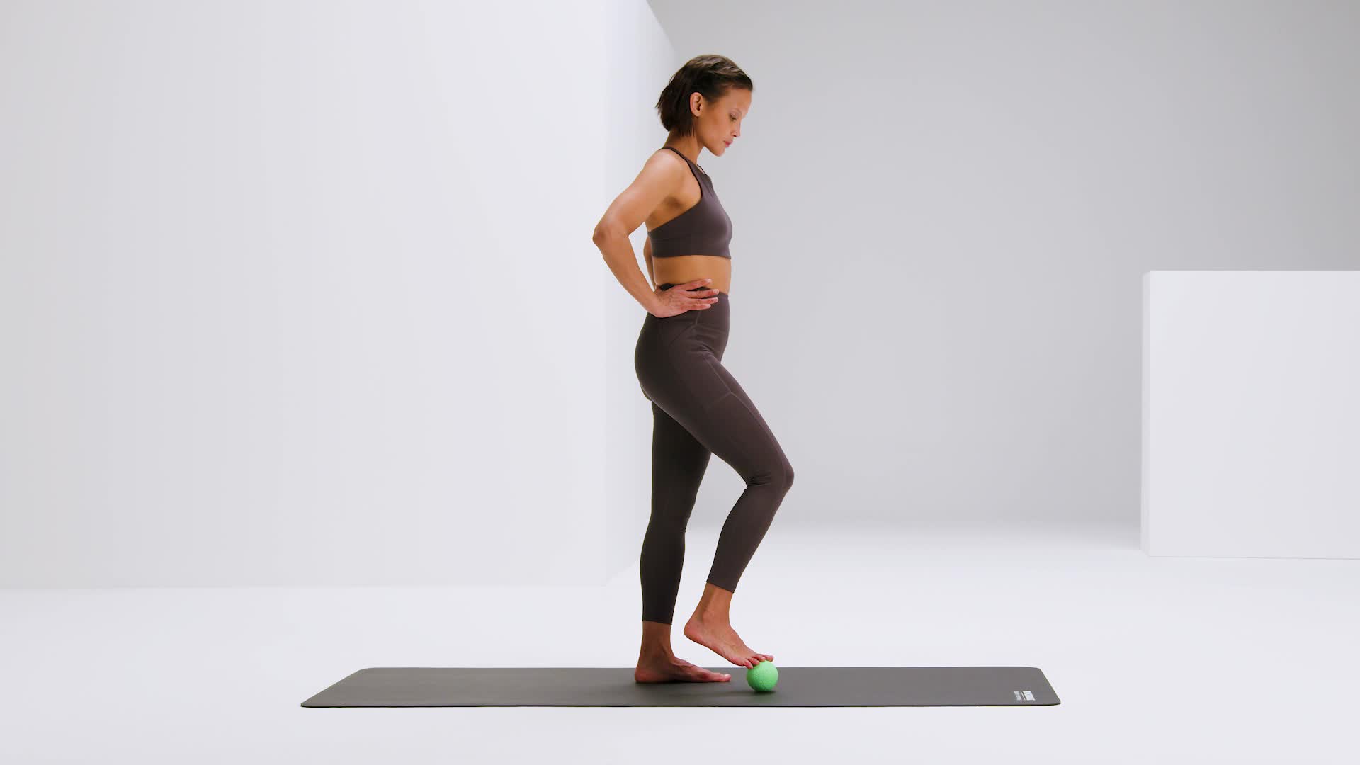 Platziere im Stehen die Fußsohle auf dem BALL. Rolle langsam vor und zurück.