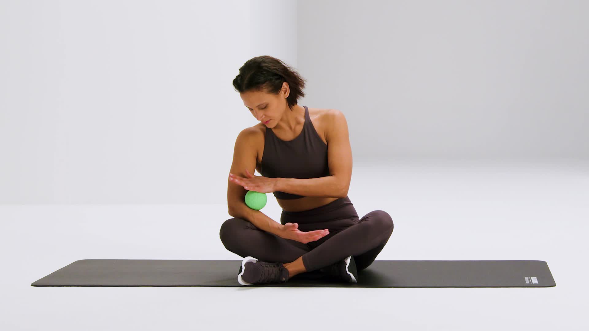 Starte in Sitzposition. Lege deinen gebeugten Arm auf dem Oberschenkel ab. Nimm den BALL 08 in die andere Hand. Drücke ihn auf deinen Unterarm. Bewege dich nun langsam in kreisenden Bewegungen über deinen Unterarm. Den Druck kannst du beliebig variieren.