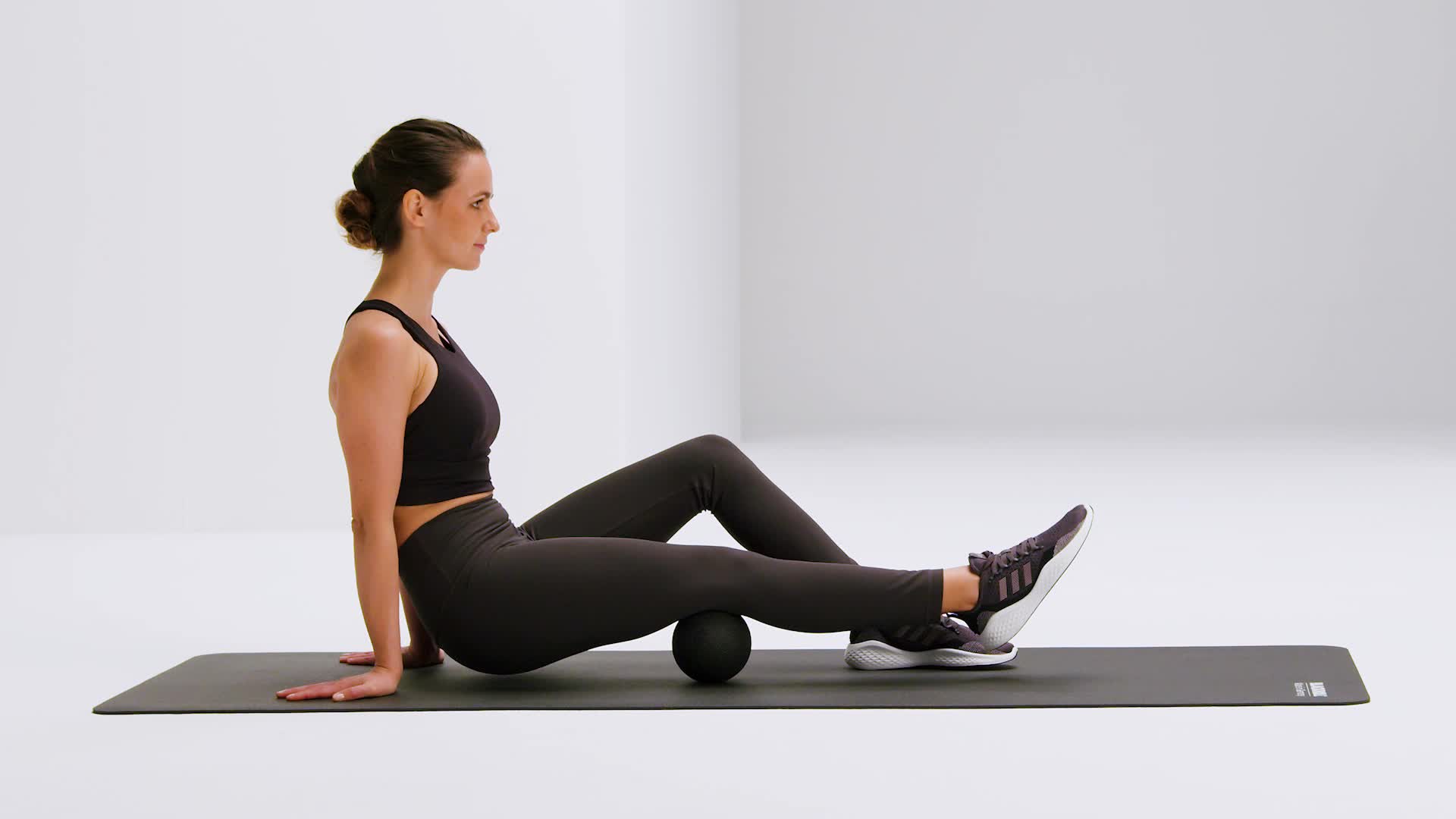 Winkel im Sitzen ein Bein an. Platziere die Wade des gestreckten Beins auf dem BALL 08. Stütze dich mit den Armen hinter deinem Körper ab. Suche nach einem Schmerzpunkt. Verharre in dieser Position. Variiere die Position des Balls.