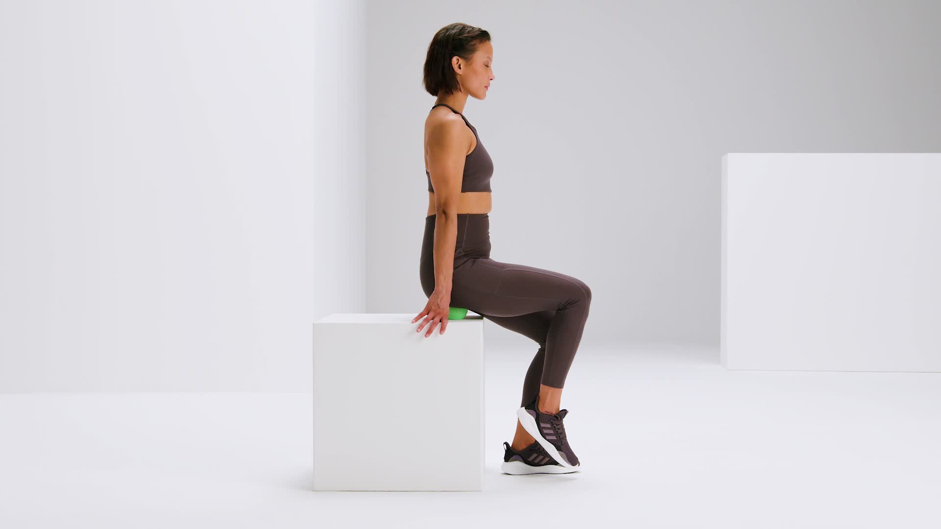 Lege in Sitzposition einen Oberschenkel auf den BALL 12. Stütze dich mit den Händen hinter deinem Rücken ab. Hebe das Gesäß. Rolle langsam die Rückseite deines Oberschenkels aus.