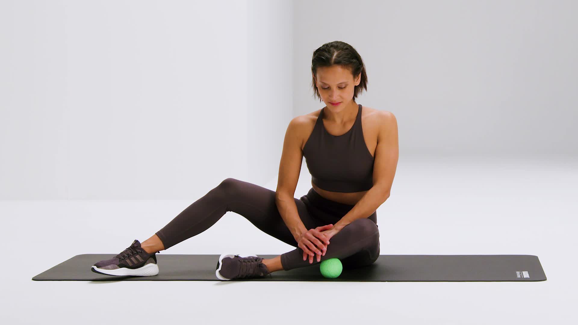 Setze dich auf den Boden. Platziere einen BALL 08 unter den äußeren Knöchel. Stütze dich mit den Händen auf dem Unterschenkel ab. Erzeuge Druck. Bearbeite auf diese Weise deine gesamte Unterschenkel-Außenseite.