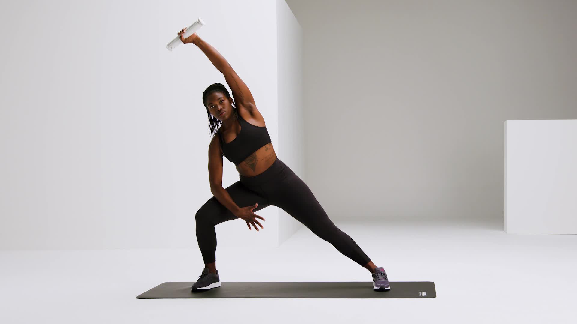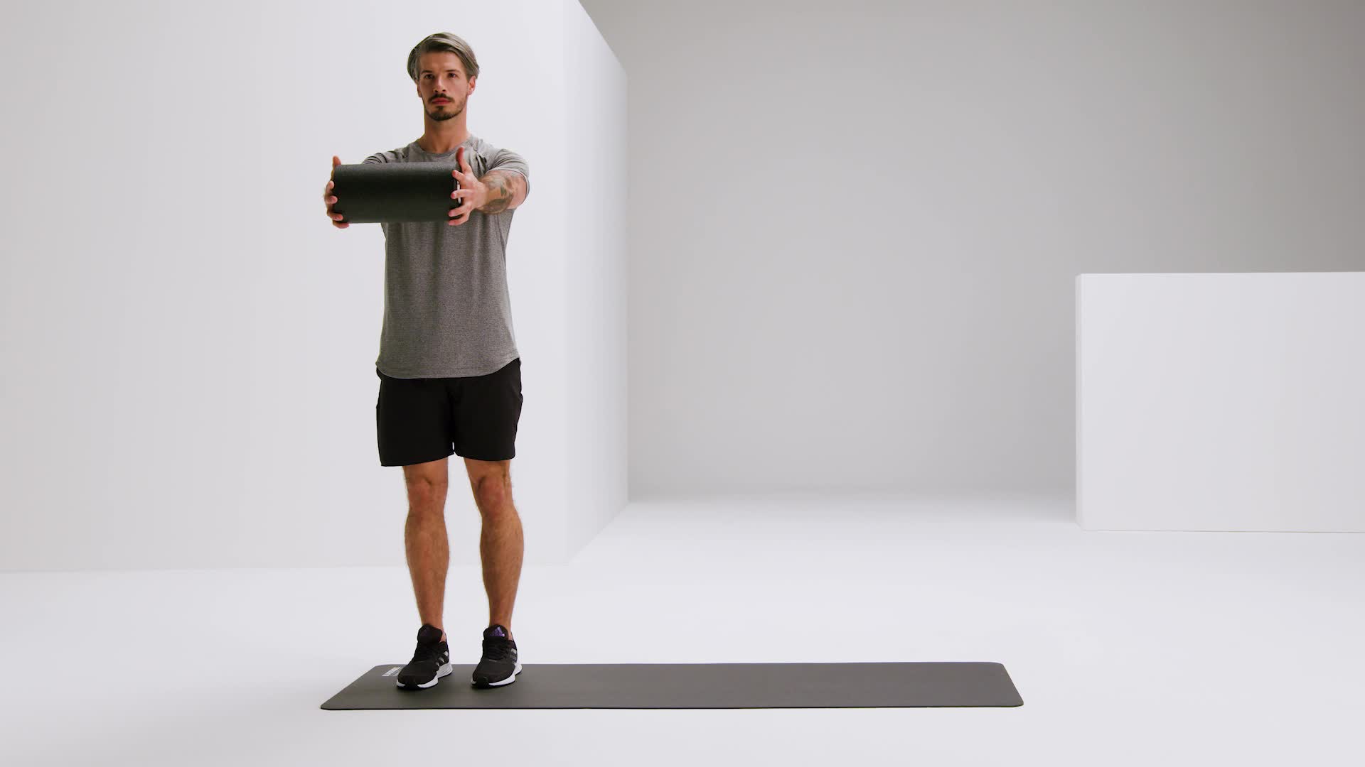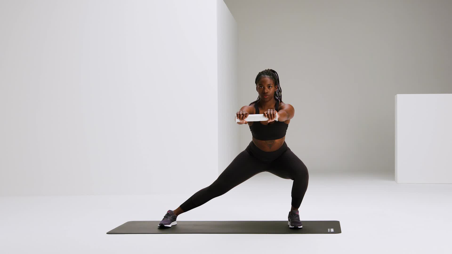 Gib den BOOSTER Vibrationskern in eine Faszienrolle und schalte diesen ein, sodass 3-4 Lichter aufleuchten. Stelle dich aufrecht hin und halte die BLACKROLL® vor dem Körper. Mache einen großen Schritt zur Seite und beuge dein Knie. Komme wieder in die Ausgangsposition zurück.