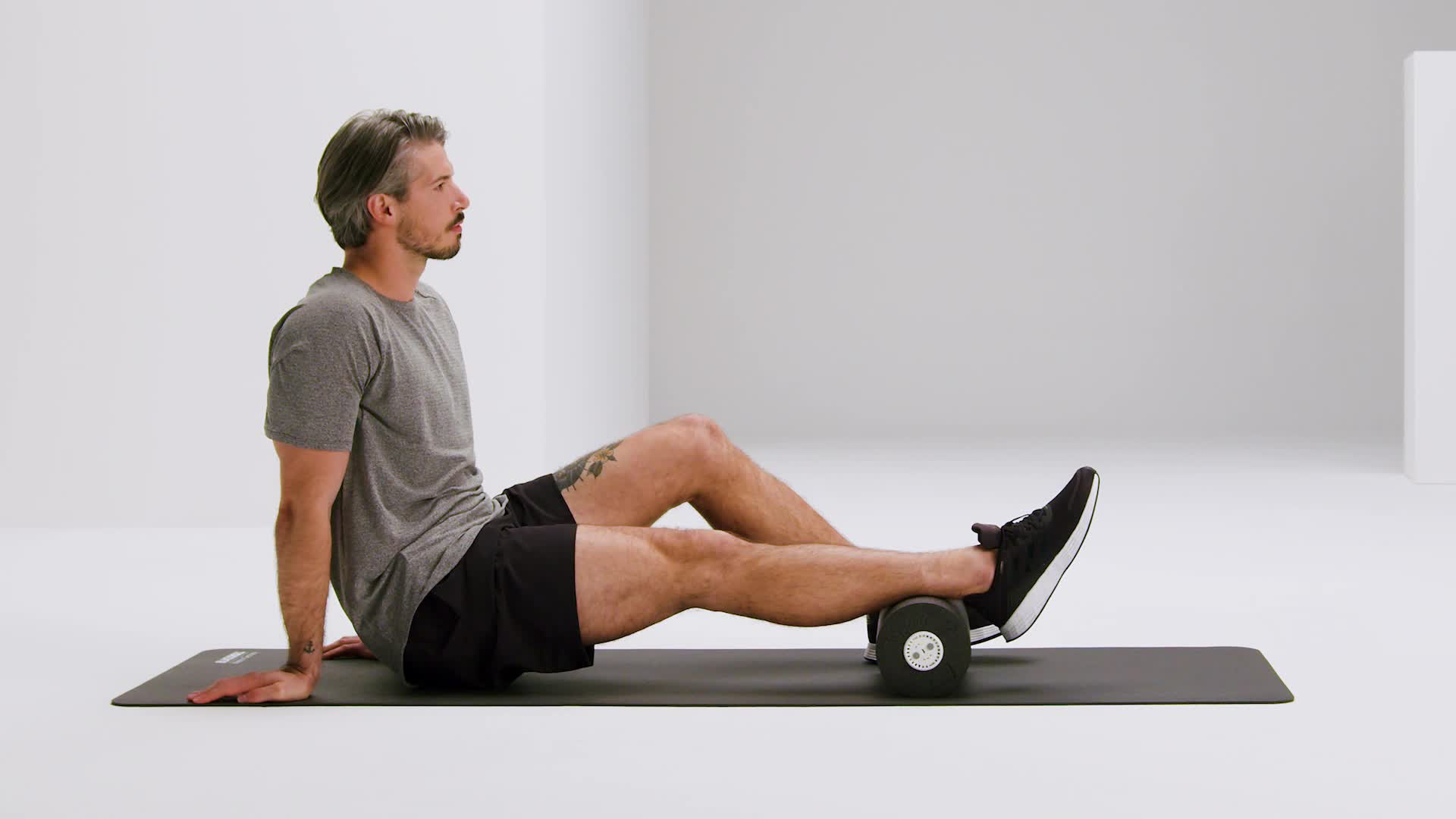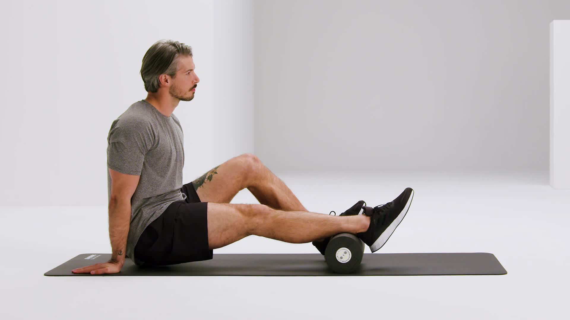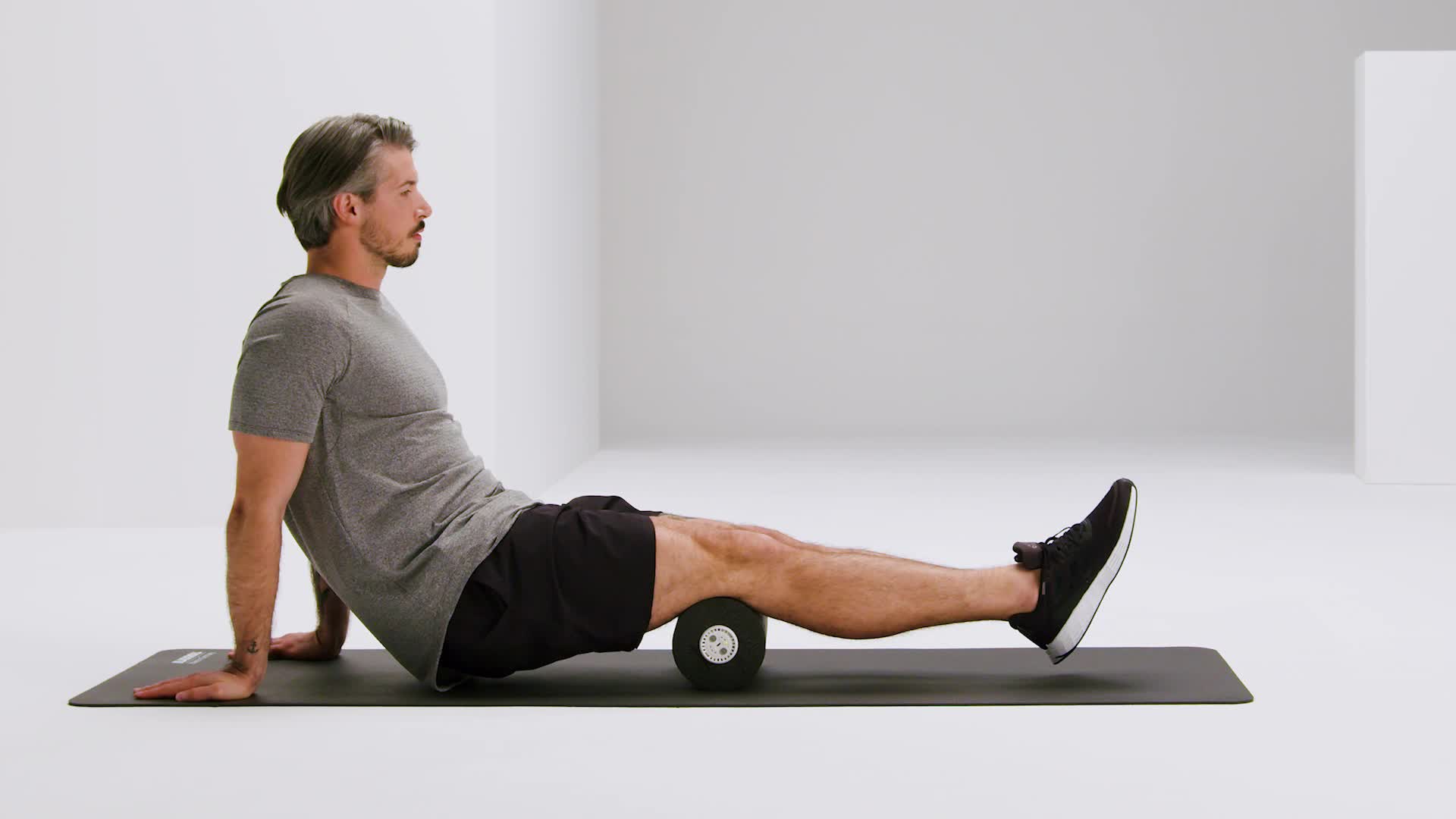 Schalte den BOOSTER ein, sodass 4-6 Lichter aufleuchten. Setze dich in den Langsitz und lege deine Wade auf die BLACKROLL. Schiebe und ziehe dich nun mit deinen Armen auf der Faszienrolle zügig vor und zurück, sodass diese entlang der Muskulatur deiner Wadenmuskulatur rollt.