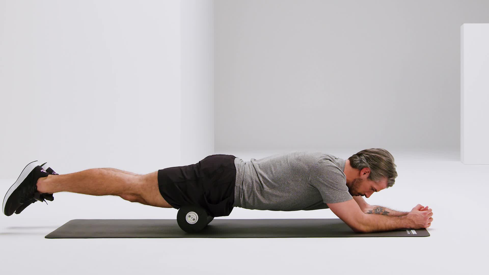 Schalte den BOOSTER ein, sodass 1-2 Lichter aufleuchten. Lege dich bäuchlings mit deinen Oberschenkelvorderseiten auf die BLACKROLL. Schiebe und ziehe dich mit deinen Armen auf der Faszienrolle langsam vor und zurück.