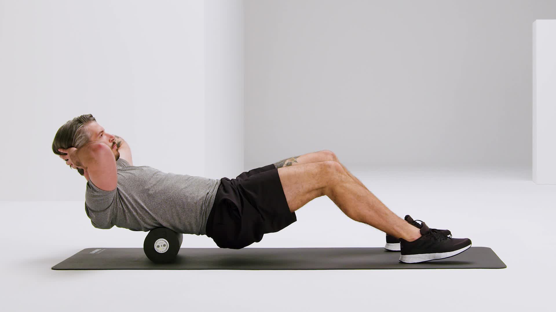 Schalte den BOOSTER ein, sodass 1-2 Lichter aufleuchten. Lege dich rücklings so auf die BLACKROLL, dass sie sich auf Höhe deiner Schulterblätter befindet. Hebe das Gesäß an. Schiebe und ziehe dich mit den Beinen auf der Faszienrolle vor und zurück.