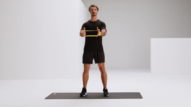 Place la BLACKROLL LOOP BAND autour de tes mains en position debout. Les paumes de tes mains pointent vers le haut. Tes coudes sont contre ton corps. Déplace les deux avant-bras sur le côté. Garde les coudes près du corps. Ramène les bras à la position de départ.