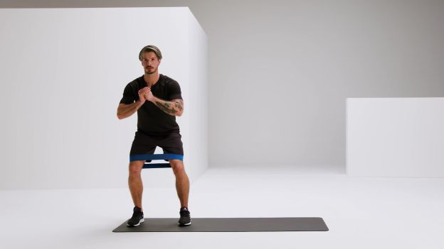 Enroule la BLACKROLL LOOP BAND autour des cuisses dans une position de largeur d'épaule. Plie les genoux. Tes cuisses sont parallèles au sol. Pousse les genoux vers l'extérieur pendant l'exercice. Reviens à la position de départ.