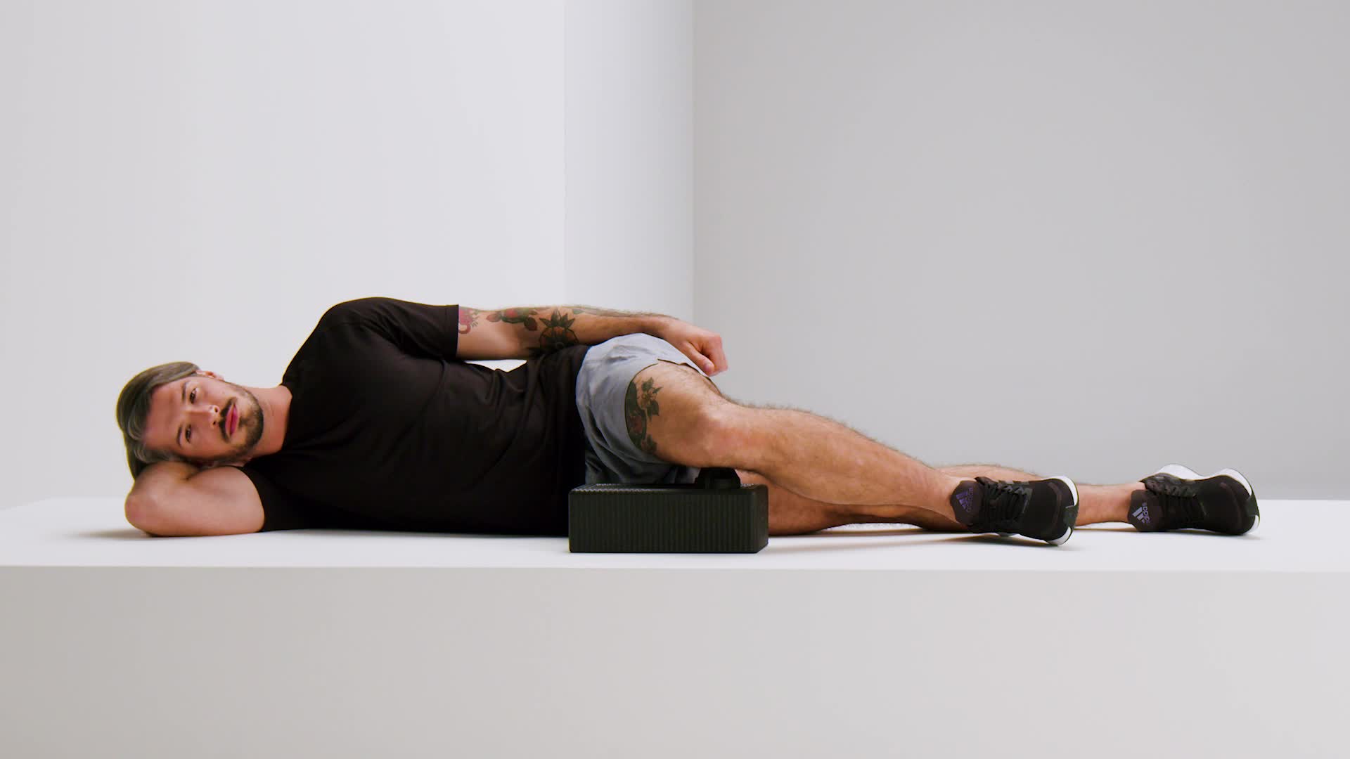 Starte im Unterarmstütz. Platziere die TWIN oberhalb des Knies. Rolle langsam deinen Oberschenkel aus.