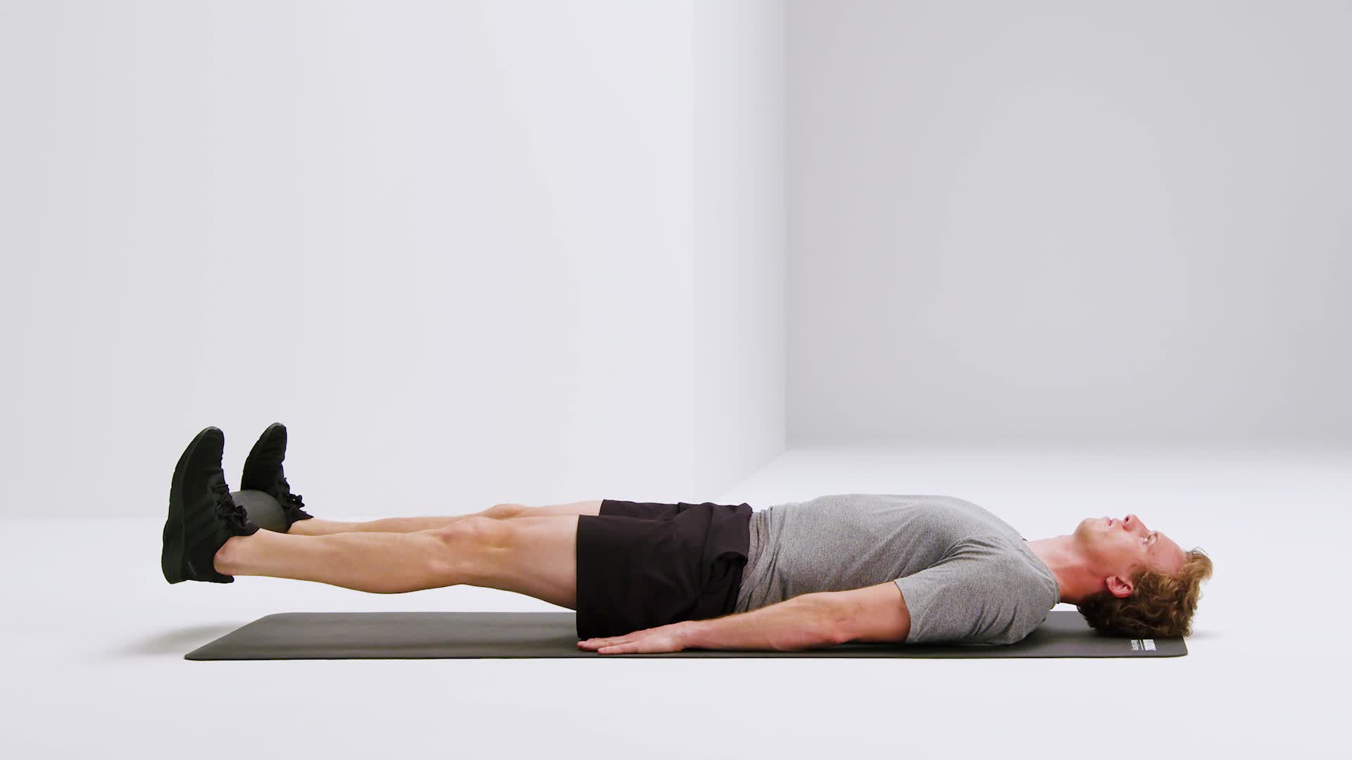 Lege dich auf den Rücken und klemme die BLACKROLL® zwischen den Füßen ein. Die Arme liegen locker neben dem Oberkörper. Aktiviere die Bauchmuskulatur und hebe die gestreckten Beine vom Boden ab.