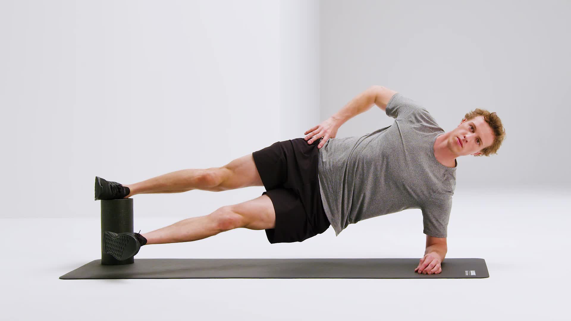 Lege den linken Unterarm auf dem Boden ab, platziere die BLACKROLL® unter deinen Füßen und komme in den Seitstütz. Die Schulter ist über dem Ellbogen und die Beine liegen gestreckt übereinander. Achte darauf, dass der Körper eine gerade Linie bildet und die Hüfte nicht durchhängt.