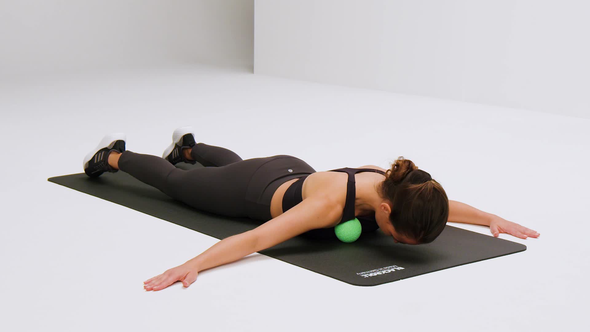 Starte in Bauchlage und platziere BALL 08 unter deiner Brust. Bewege zügig deinen Oberkörper hin- und her um die Brust zu massieren. Alternativ kannst du auch deinen Arm nach oben strecken und wieder ranziehen.