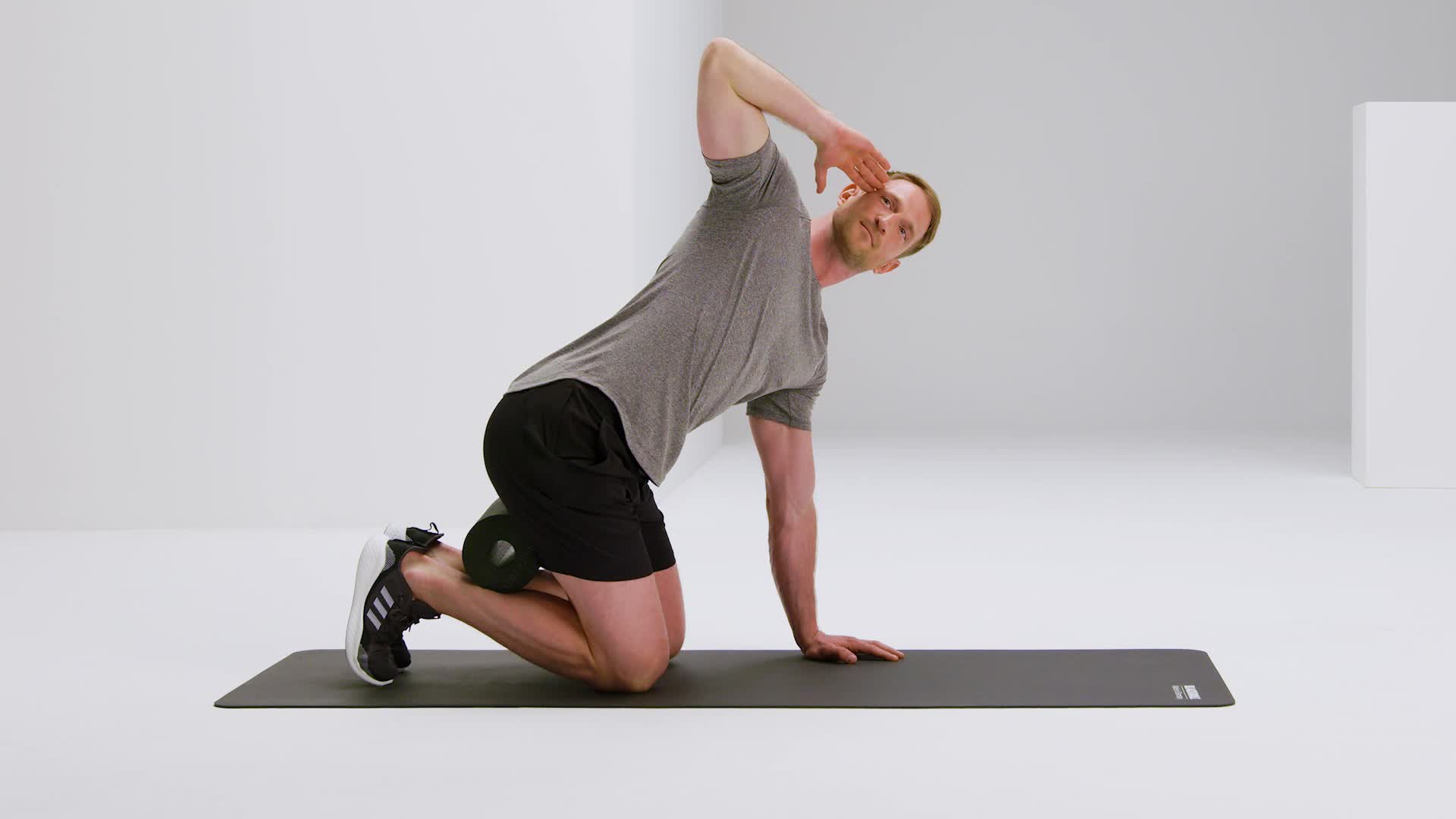 Starte im Vierfüßlerstand. Deine Füße sind aufgestellt. Lege die BLACKROLL auf deinen Unterschenkeln ab. Setze dich nach hinten. Klemme die BLACKROLL zwischen Gesäß und Unterschenkeln ein, um eine stabile Position für deine Lendenwirbelsäule zu erreichen. Drücke die BLACKROLL mit deinem Gesäß nach unten. Greife mit einer Hand an die Schläfe. Rotiere die Brustwirbelsäule in Richtung Decke. Halte in dieser Position kurz inne.