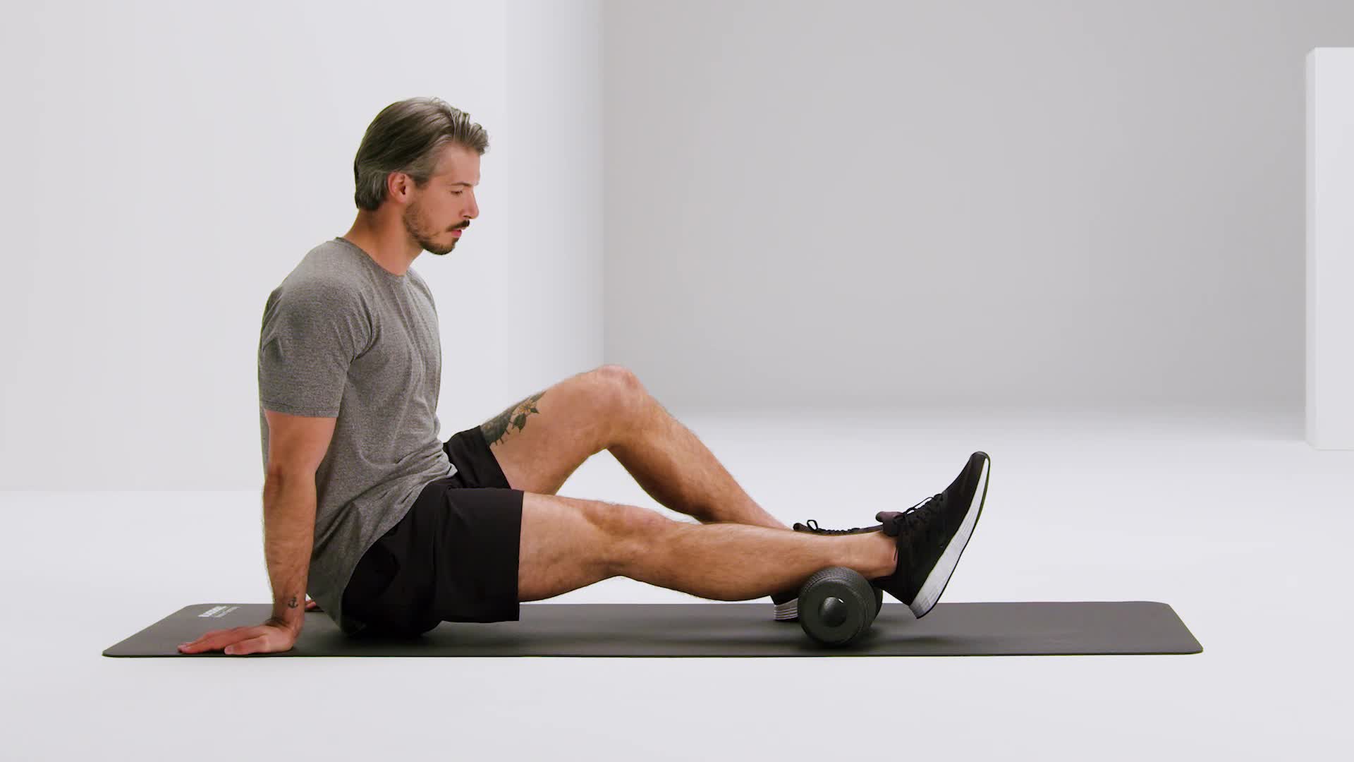 Angle one leg while sitting. Place the calf of the stretched leg in the notch of the TWIN. Lift your buttocks off the floor. Roll out your calf quickly.