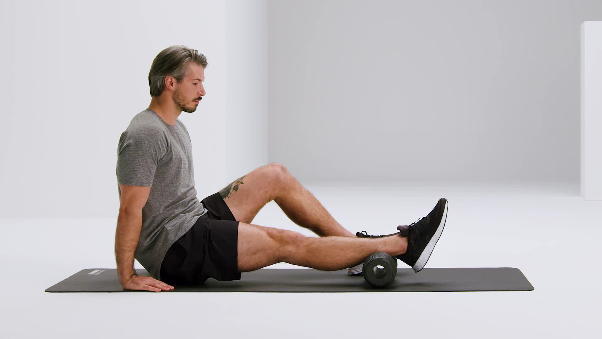 Angle one leg while sitting. Place the calf of the stretched leg in the notch of the TWIN. Lift your buttocks off the floor. Slowly roll out your calf.