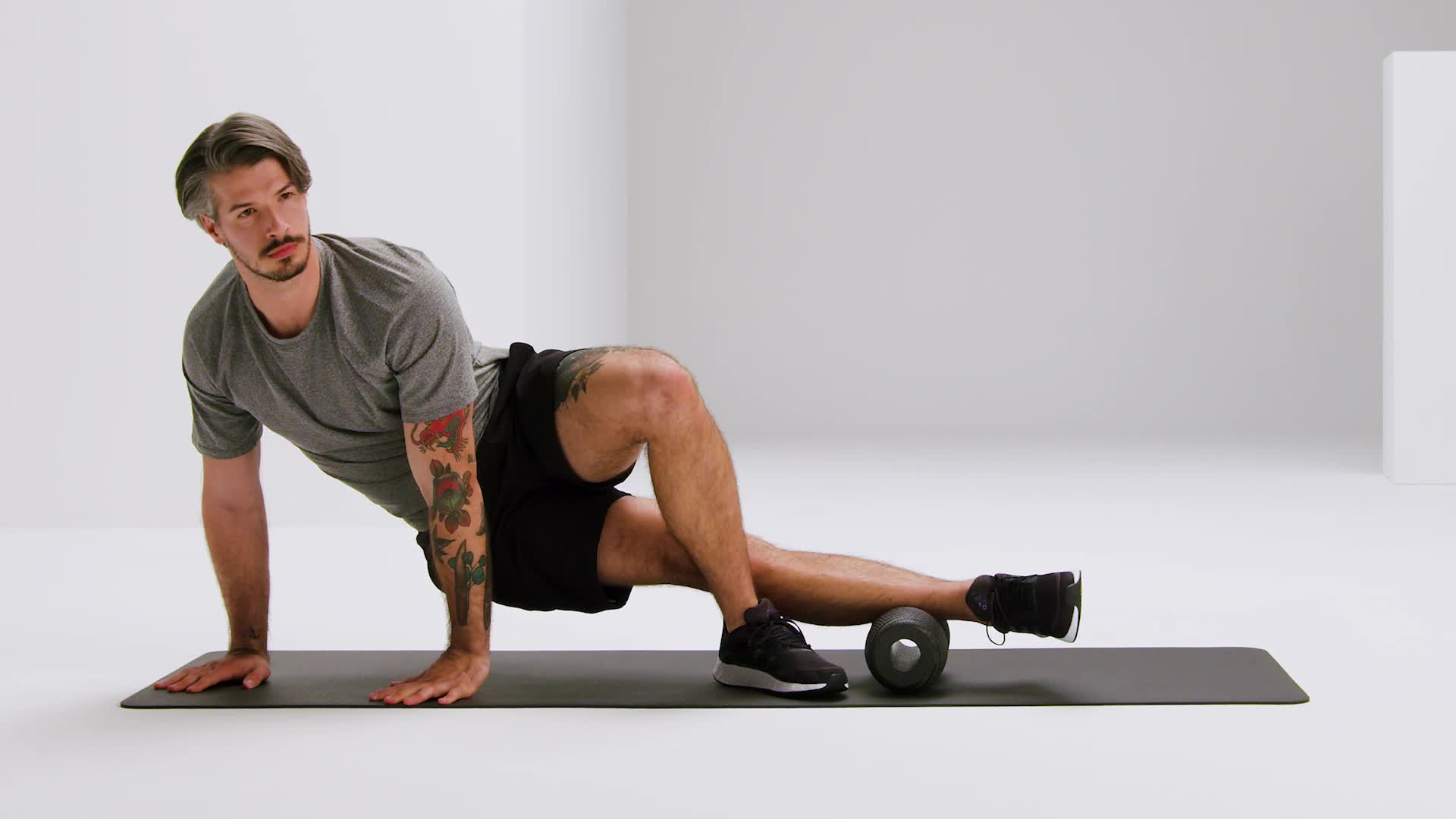 Place your outer thigh on the TWIN. Place the other leg in front of your body. Support yourself on your hands. Raise the buttocks. Slowly roll out your thigh.
