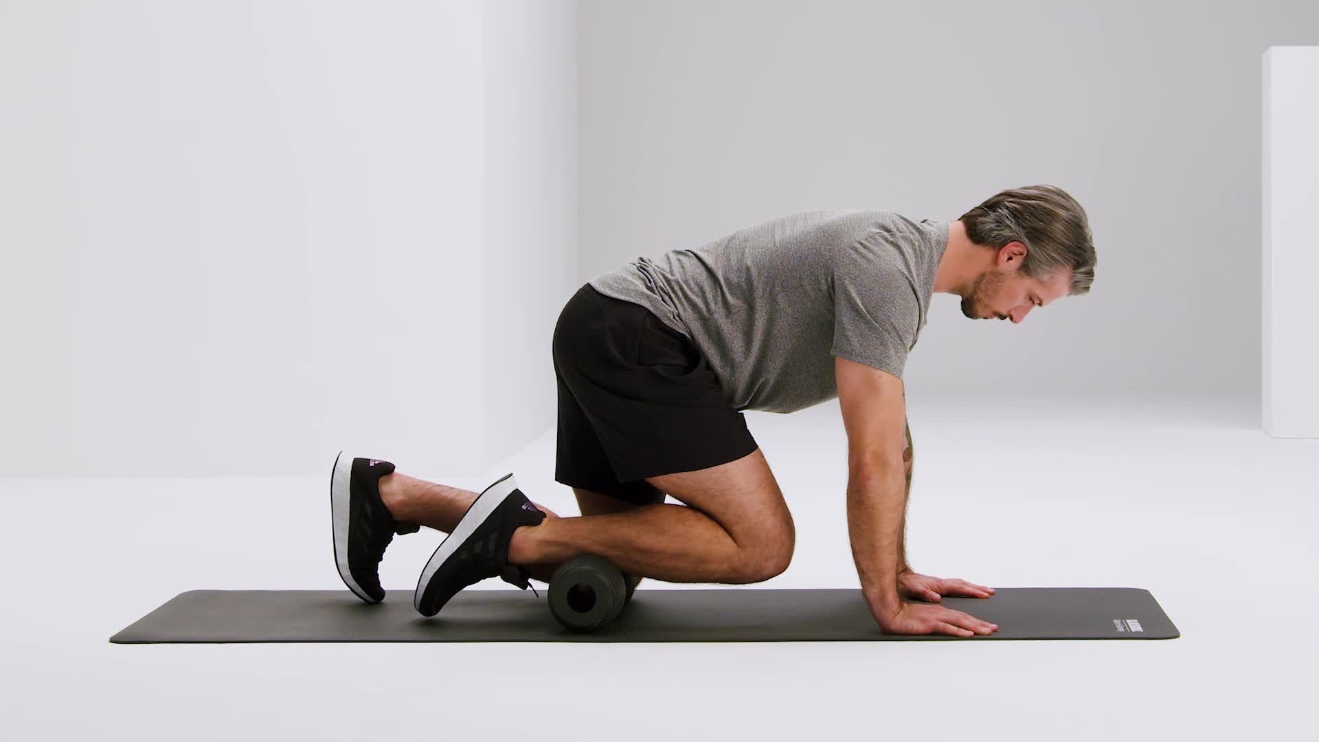 Place your outer lower leg on the TWIN. Place the other leg in front of your body. Support yourself on your hands. Raise the buttocks. Slowly roll out your lower leg.