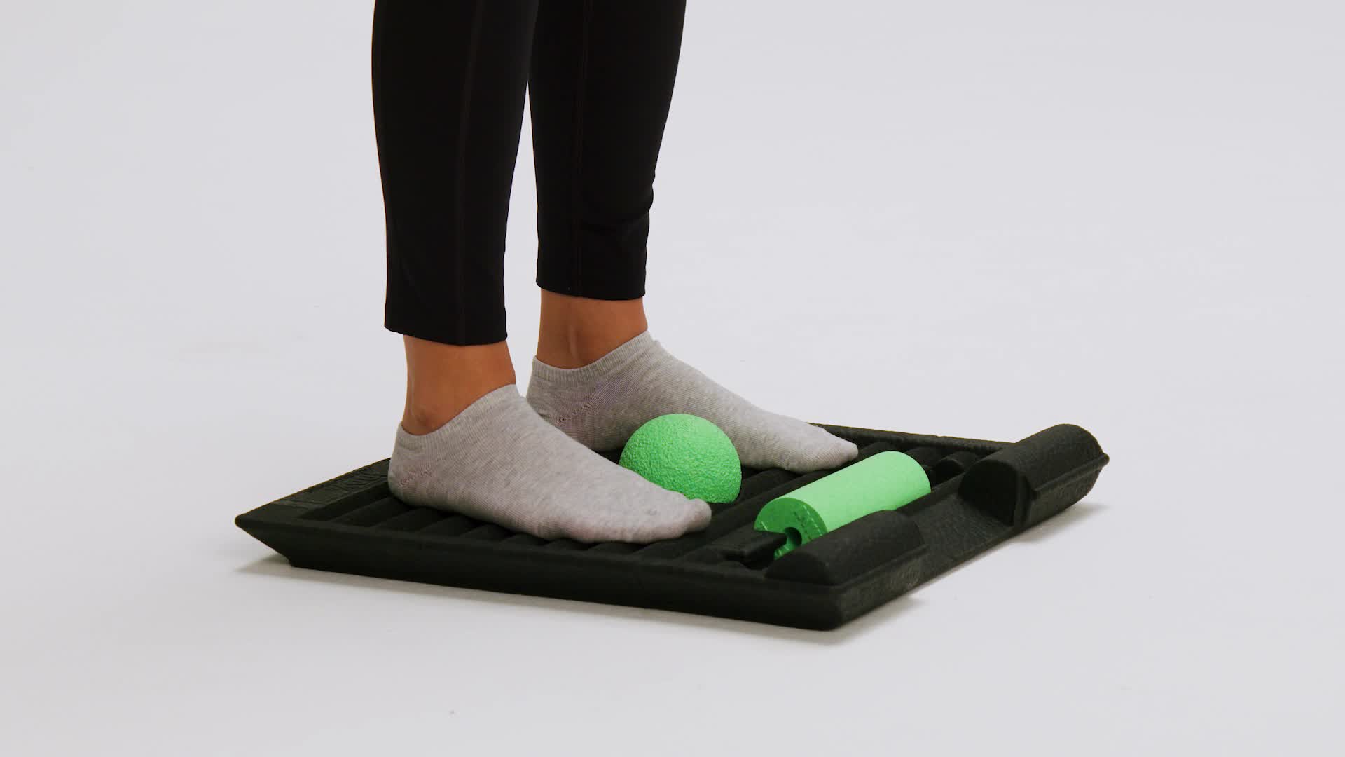 Stand hip-width apart on the SMOOVE BOARD. Place one foot on the TWISTER. Find pain points in the sole of your foot. Apply pressure to these points. At the same time, work with twisting movements, which you maintain until the pain subsides.