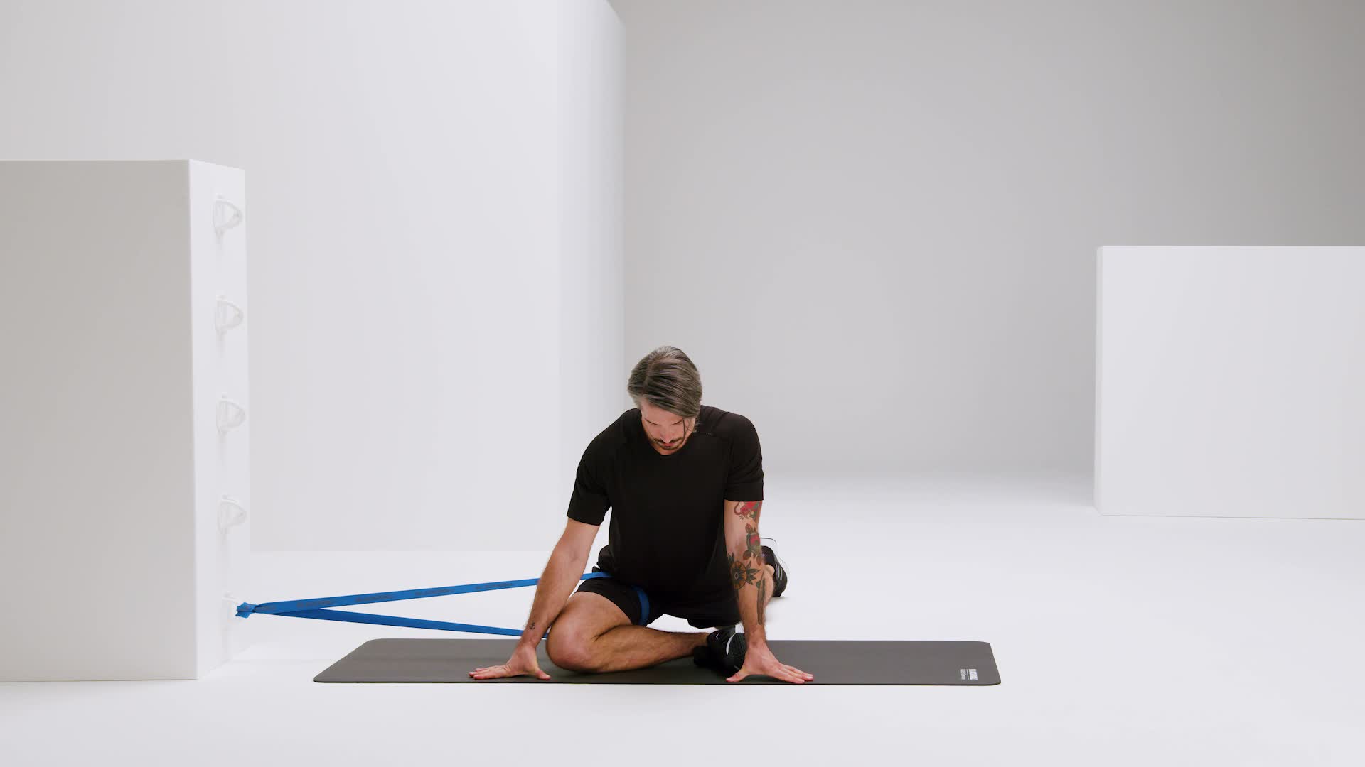 Commencez en position quadrupède et placez le SUPER BAND autour de l'intérieur de votre cuisse. Placez la bande aussi près de la hanche que possible. Maintenant, amenez une jambe devant le corps et pliez-la au niveau du genou de 45 à 90°, aussi loin que vous le pouvez.