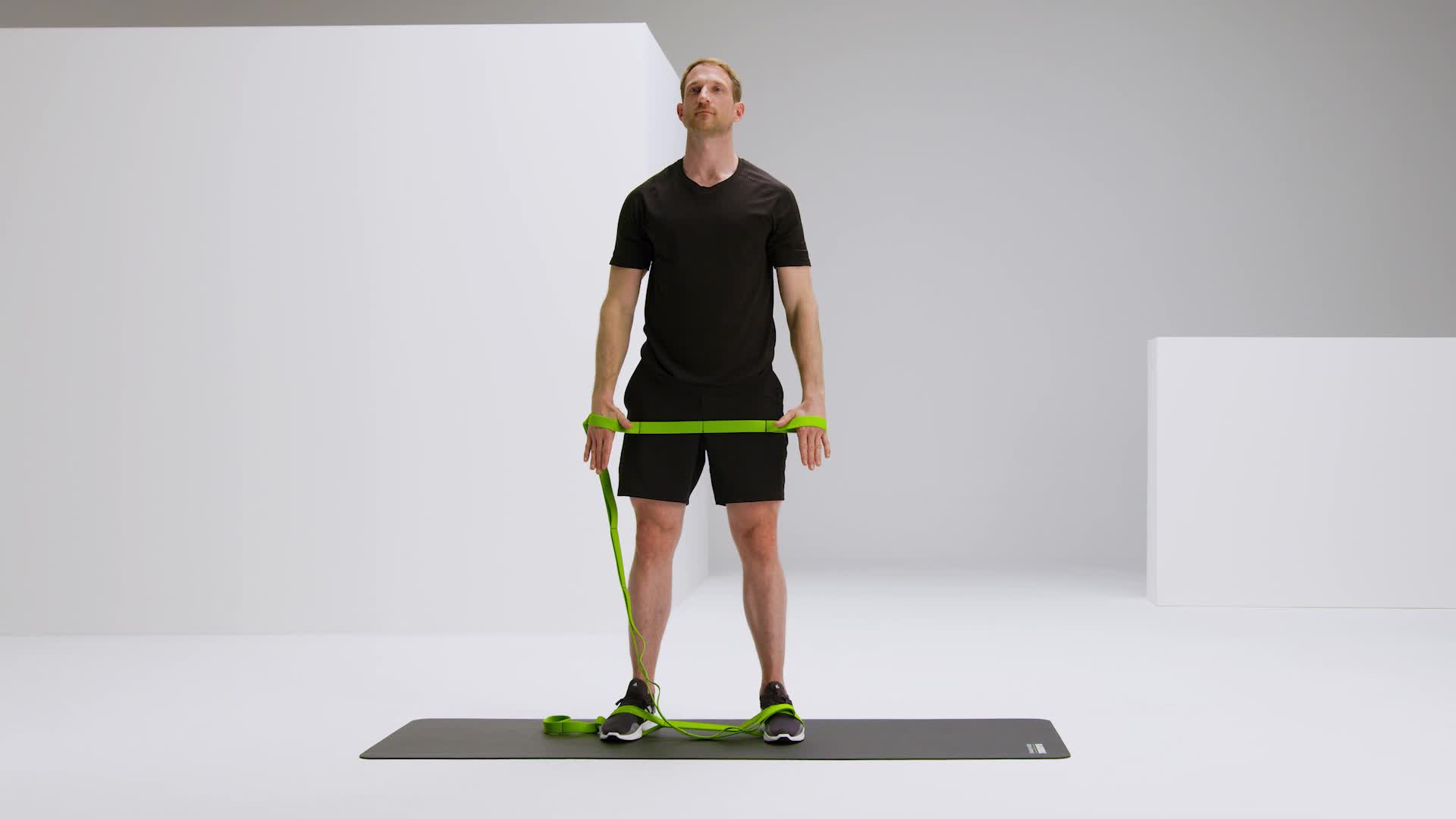 Positionnez le MULTI BAND devant vous, au niveau de vos hanches, et passez vos mains dans les boucles, en passant par l’intérieur. Tenez-vous droit et pliez légèrement les genoux. Contractez les fessiers et les muscles du tronc. Tirez la bande élastique au-dessus de votre tête et étirez complètement vos bras