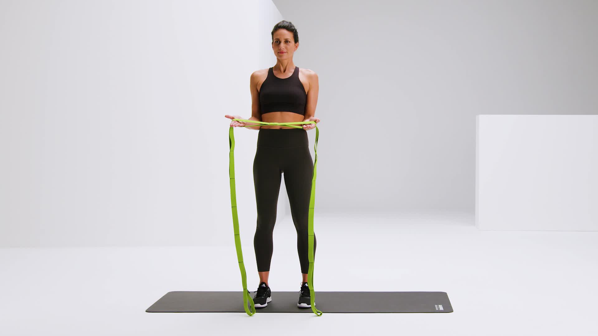 Mettez-vous debout et écartez les pieds de la largeur des épaules. Maintenez les coudes près du corps et tournez les paumes des mains vers le plafond. Attrapez la MULTI BAND et tendez -la en la tirant vers l’extérieur en position de départ.