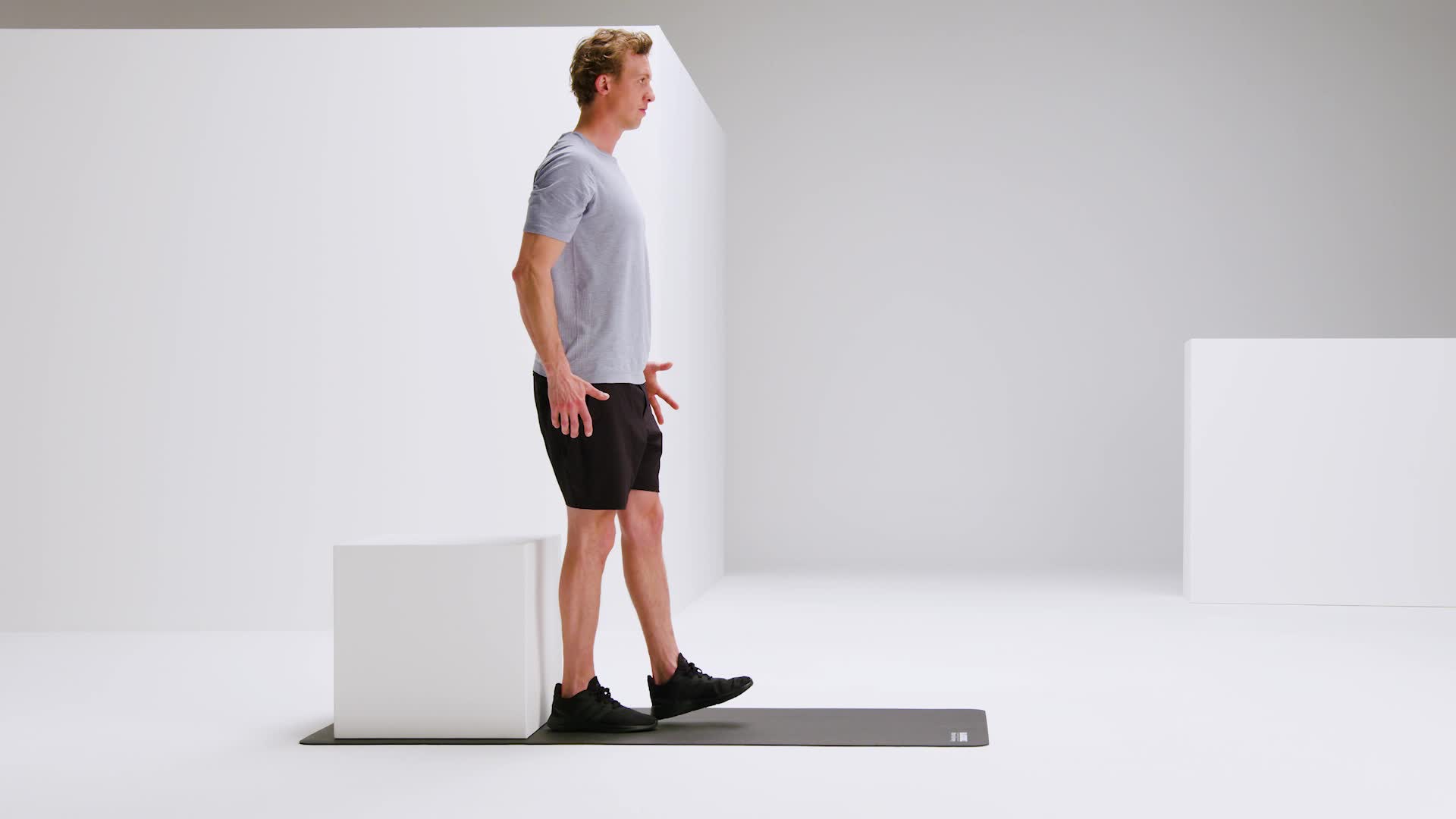 Placez une chaise de la hauteur de votre tibia ou de votre genou derrière vous et mettez-vous devant, bien droit(e), les pieds écartés de la largeur des épaules. Déplacez votre poids sur une jambe et tendez l’autre devant vous.