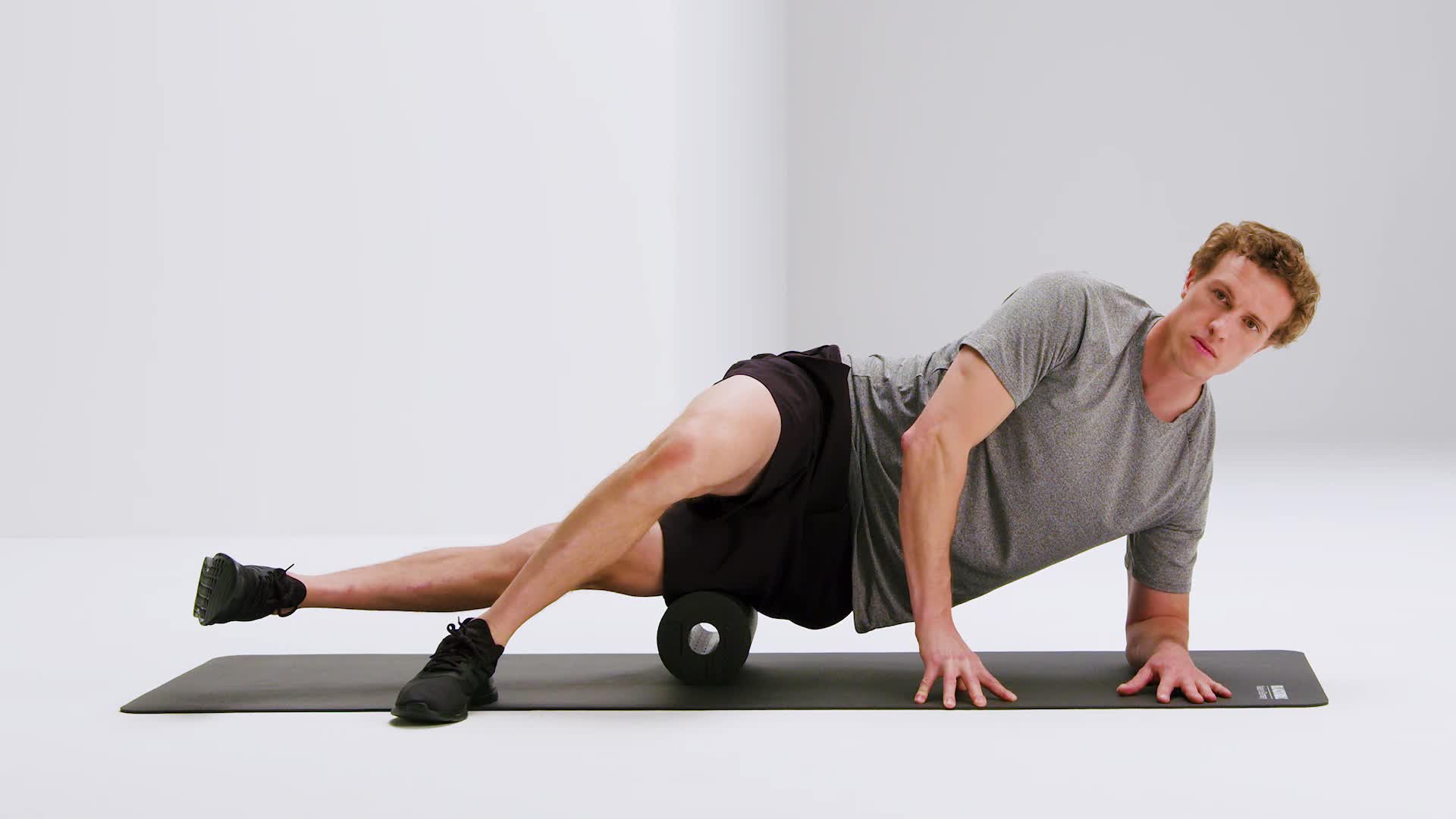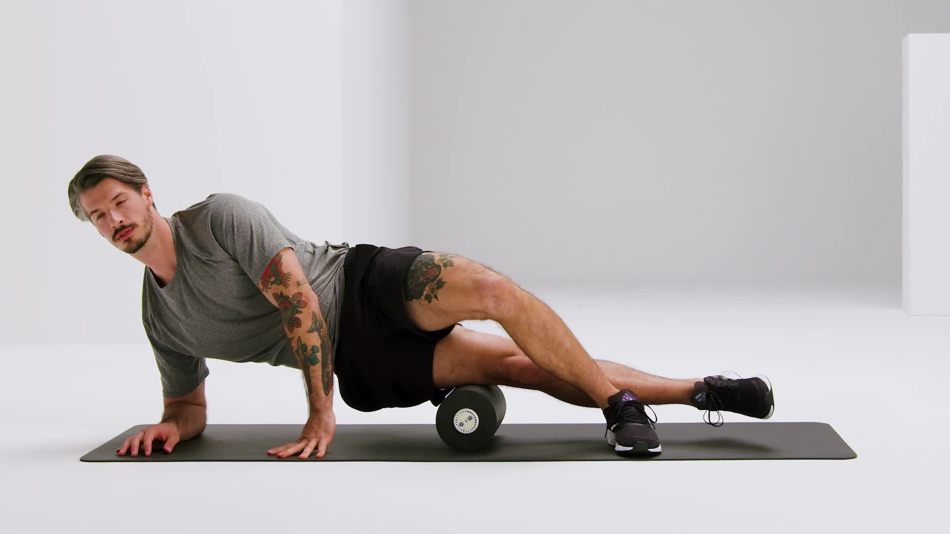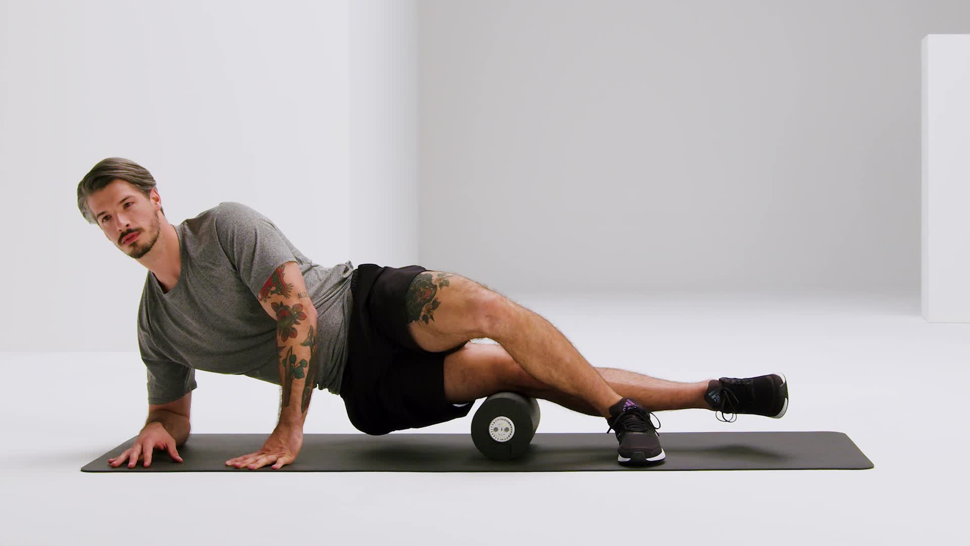 Plaats je buitenste dij op de BLACKROLL. Plaats je andere been voor je lichaam. Ondersteun jezelf op je handen. Doe je billen omhoog. Rol je dij uit. Blijf bij je pijnpunten. Buig en strek de knie een paar keer.