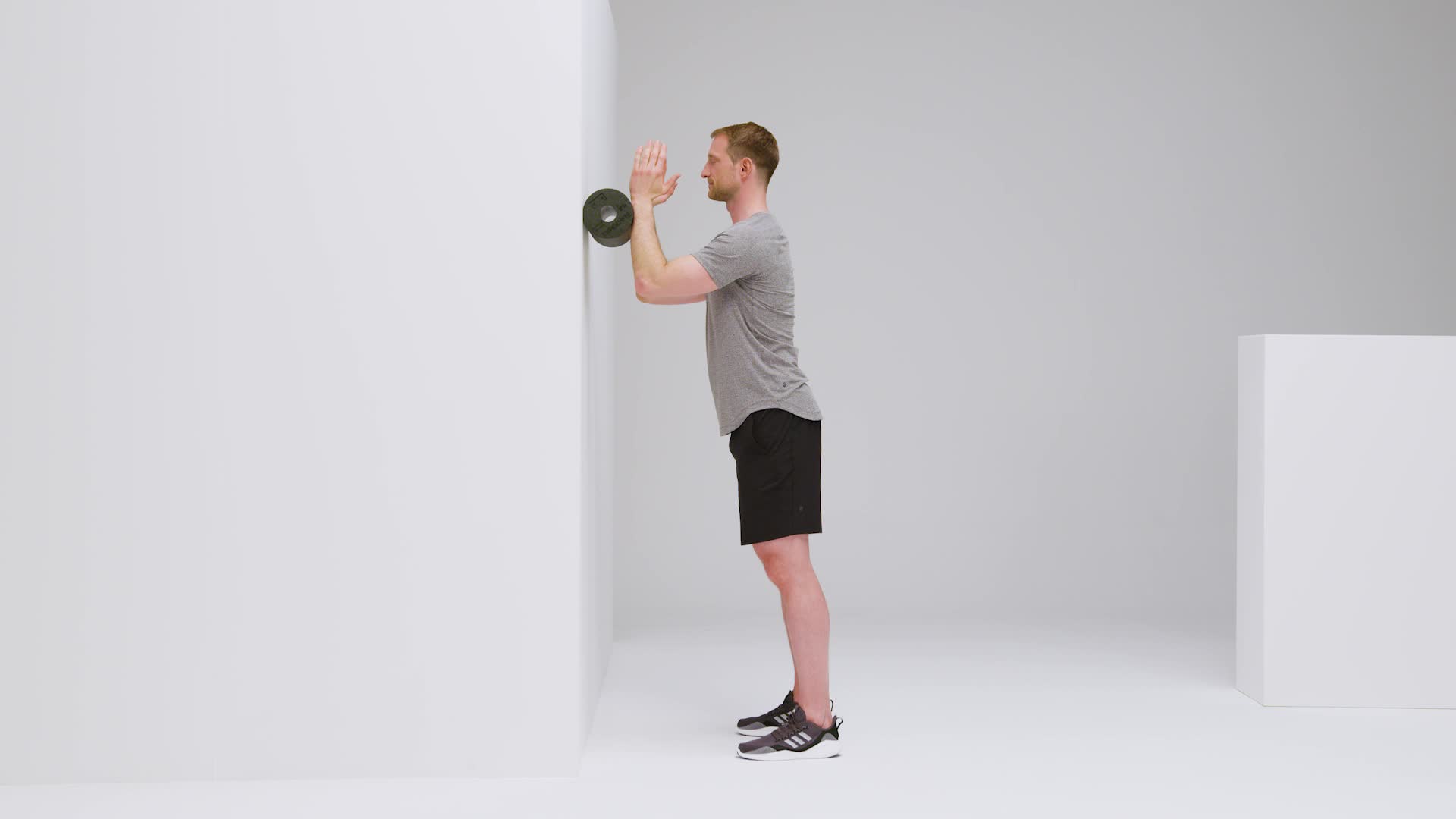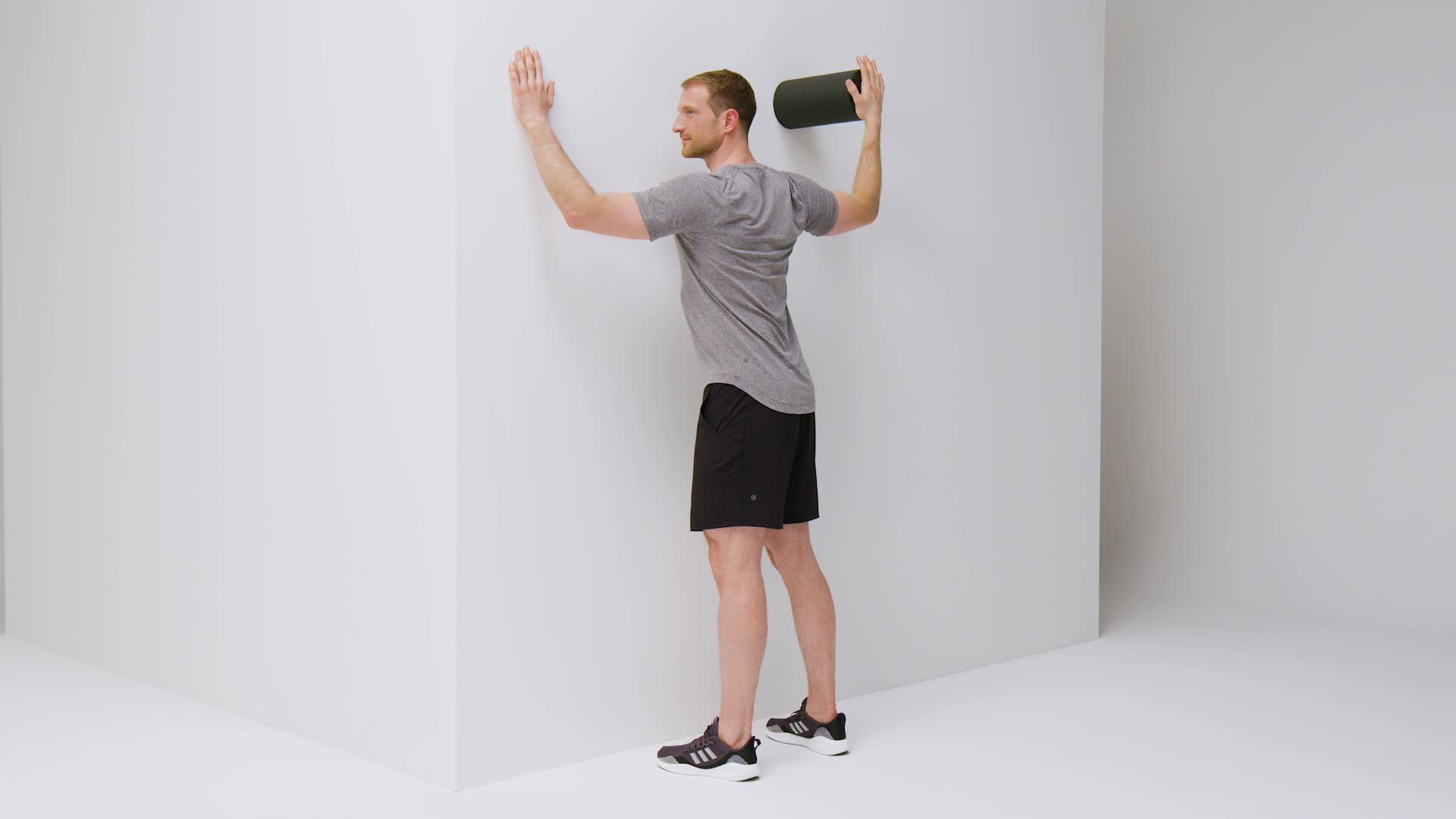 Start in een rechtopstaande houding voor een muur. Plaats de BLACKROLL ter hoogte van de hals. Houd het op zijn plaats met je polsen. Bouw druk op met je onderarmen en laat je schouderbladen naar voren glijden. Duw de BLACKROLL naar boven en houd de druk hoog.