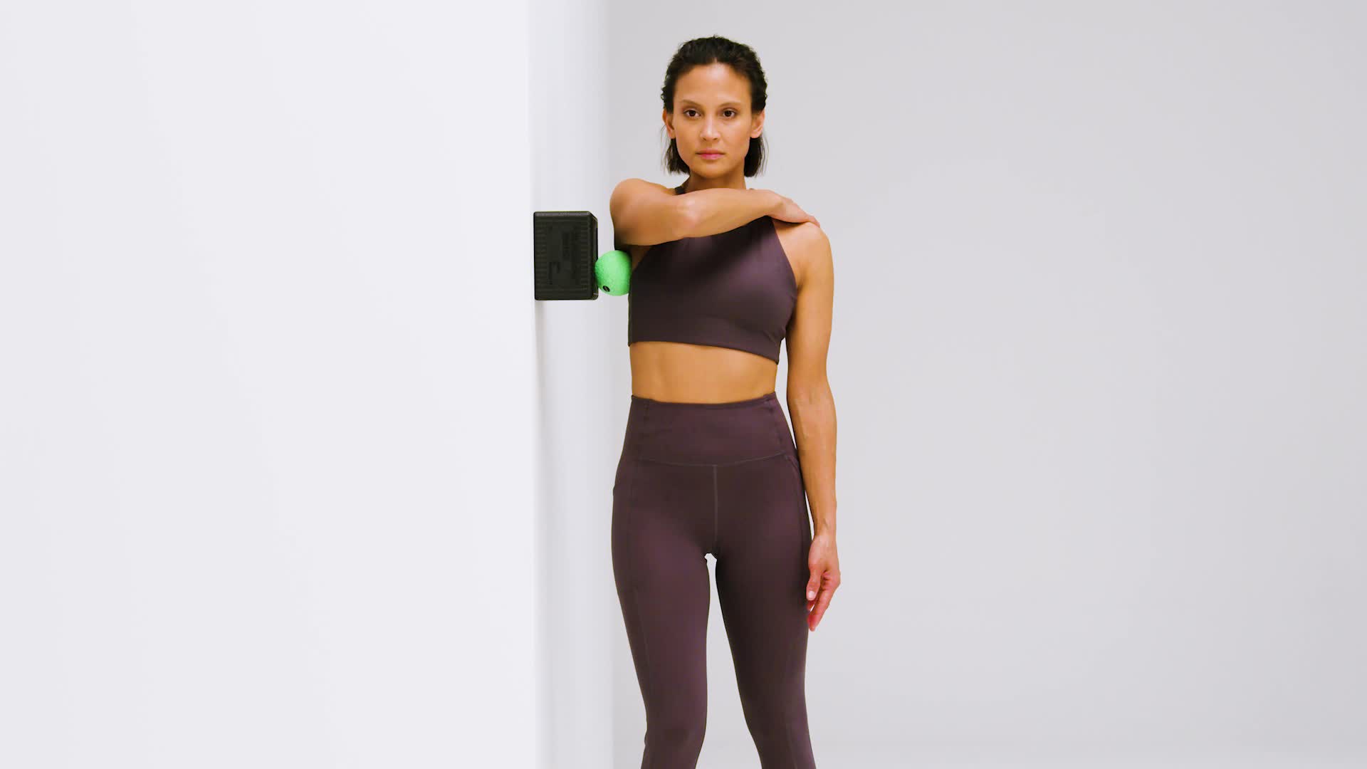 Positioneer de BLOK kruislings op schouderhoogte tegen een muur. Ga er zijdelings tegenaan staan. Plaats de BALL in het onderste deel van je oksel. Druk het dwars naar achteren in de stof.