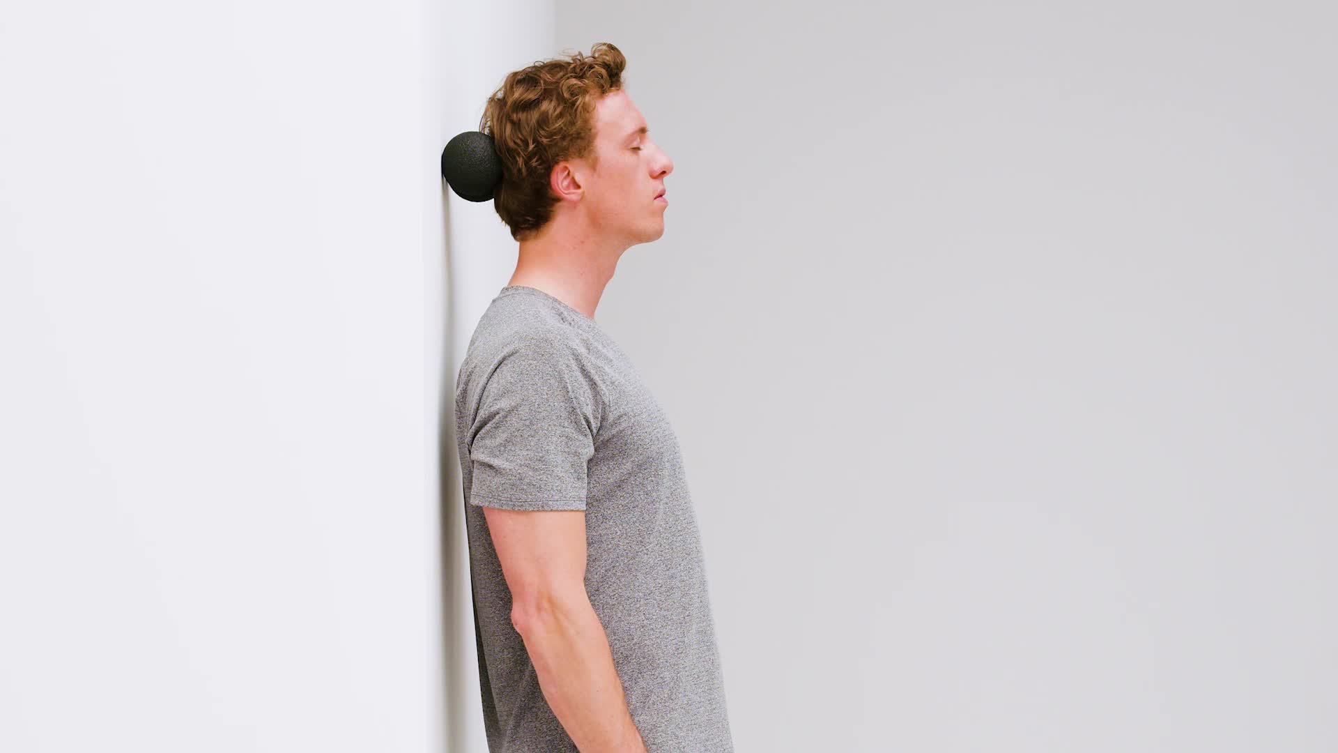 Klem de DUOBALL 08 tussen het achterhoofd en een muur. Werk in kleine knikkende bewegingen van de nek naar de kruin van het hoofd.