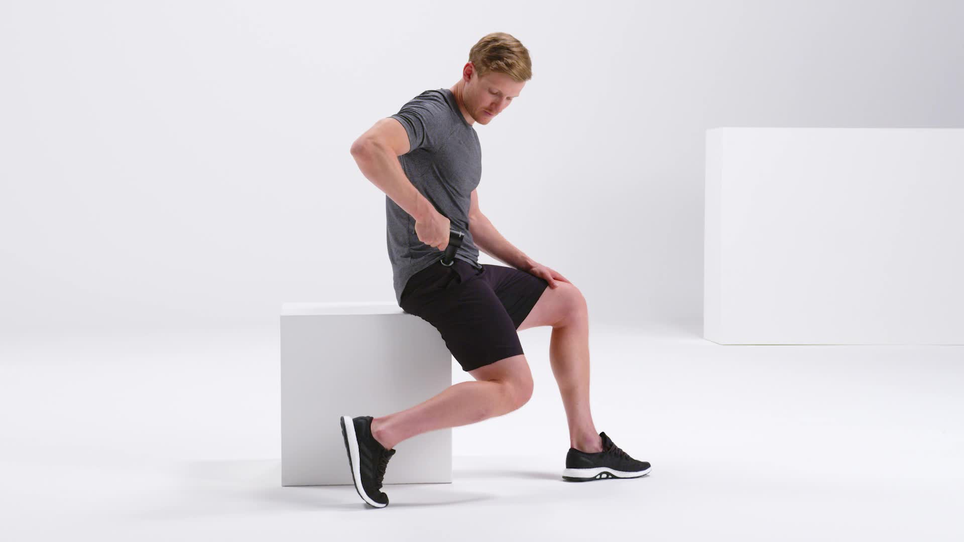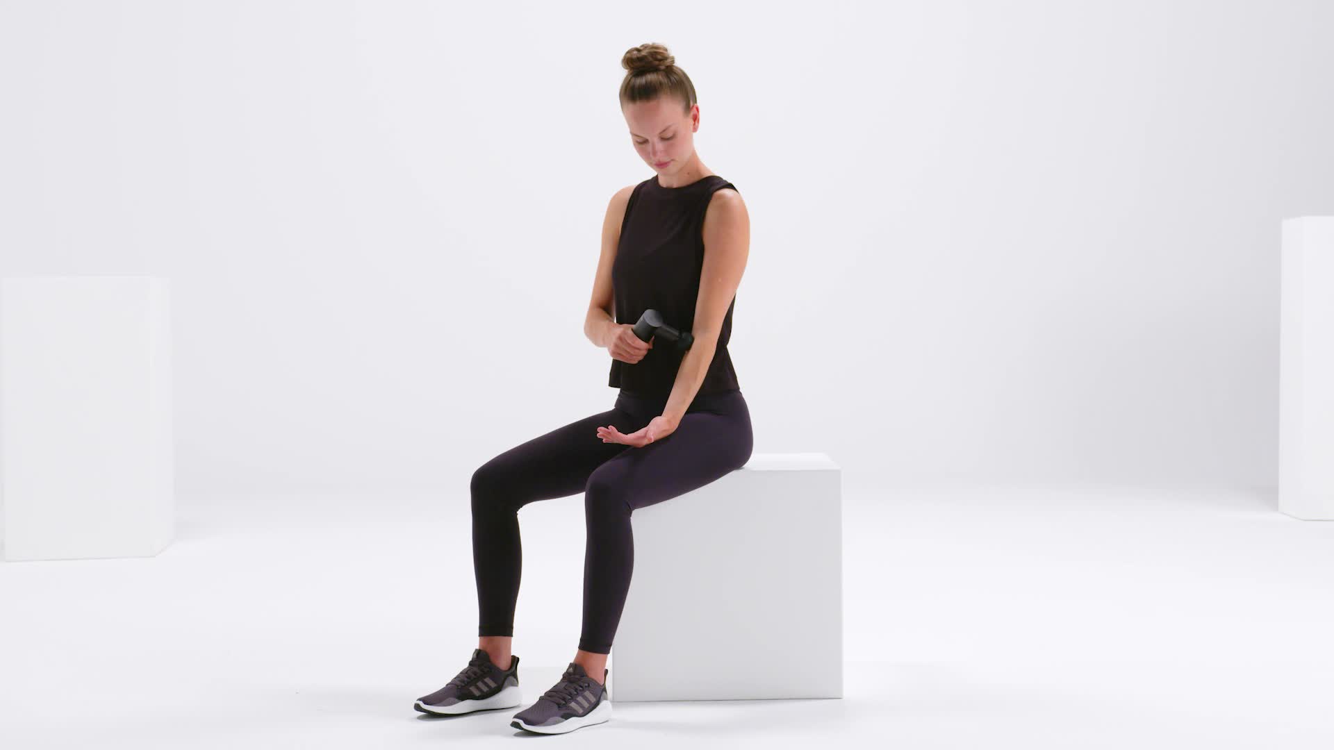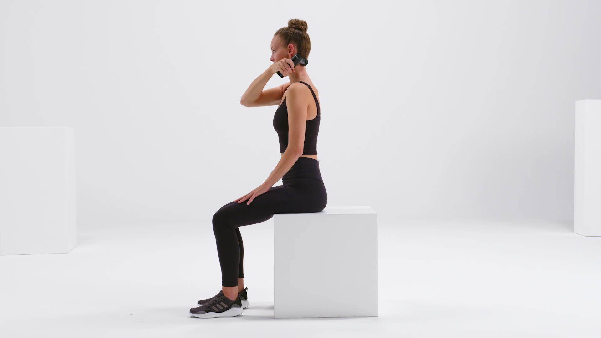 Met het massagepistool kun je gemakkelijk myofasciale zelfmassage-oefeningen in jouw dagelijks leven opnemen. Afhankelijk van de intensiteit van de vibratie die je kiest, kun je de aangename vibratie gebruiken om spieren en fascia te regenereren of om ze te activeren, bijvoorbeeld voor een sportsessie. Hieronder zie je welke oefeningen je met het massagepistool kan doen.