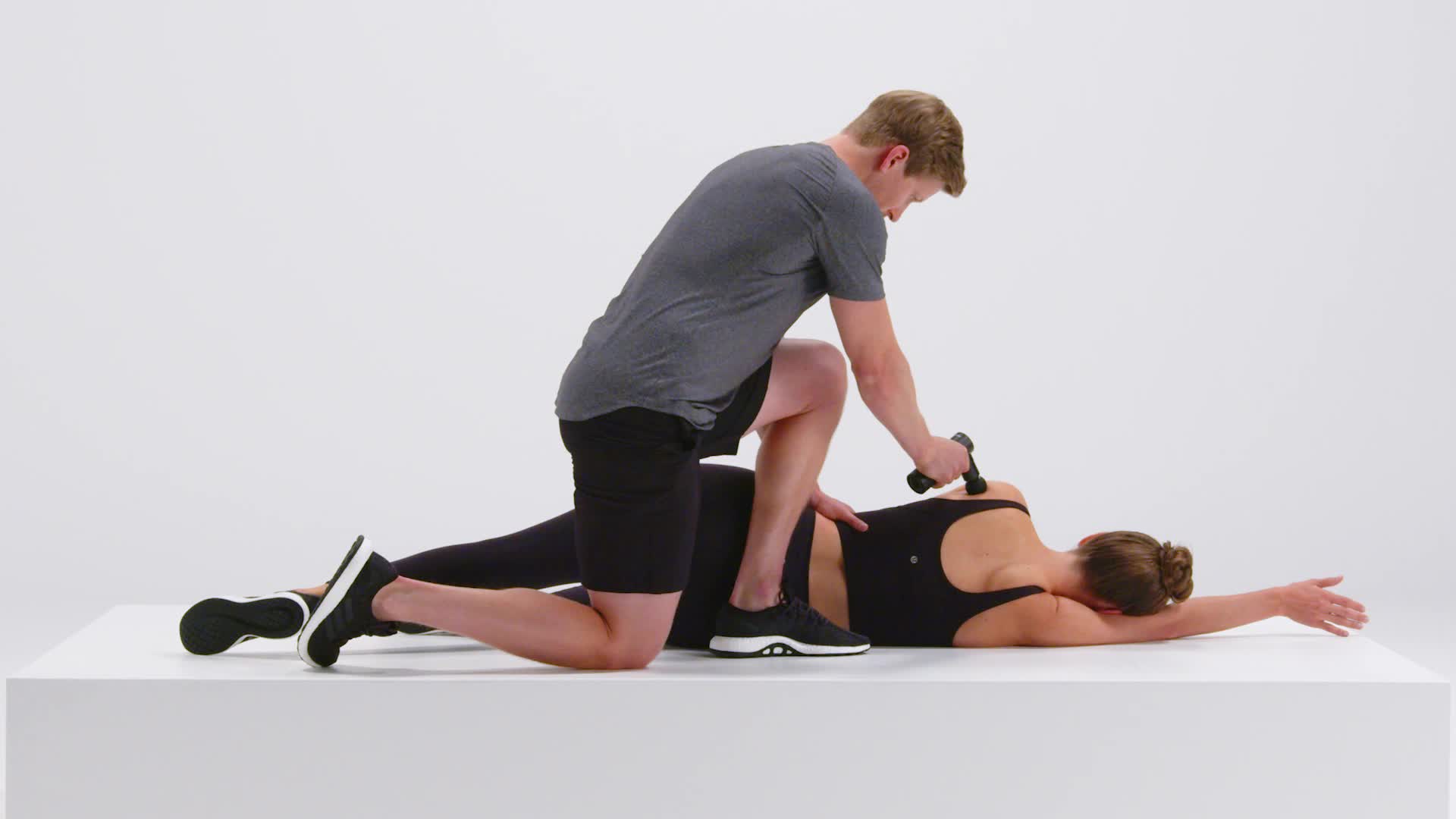 Begin in buikligging. Klem je handen voor je gezicht en laat je voorhoofd erop rusten. Je partner behandelt je bilspieren. Gebruik het pistool alleen op het zachte weefsel.