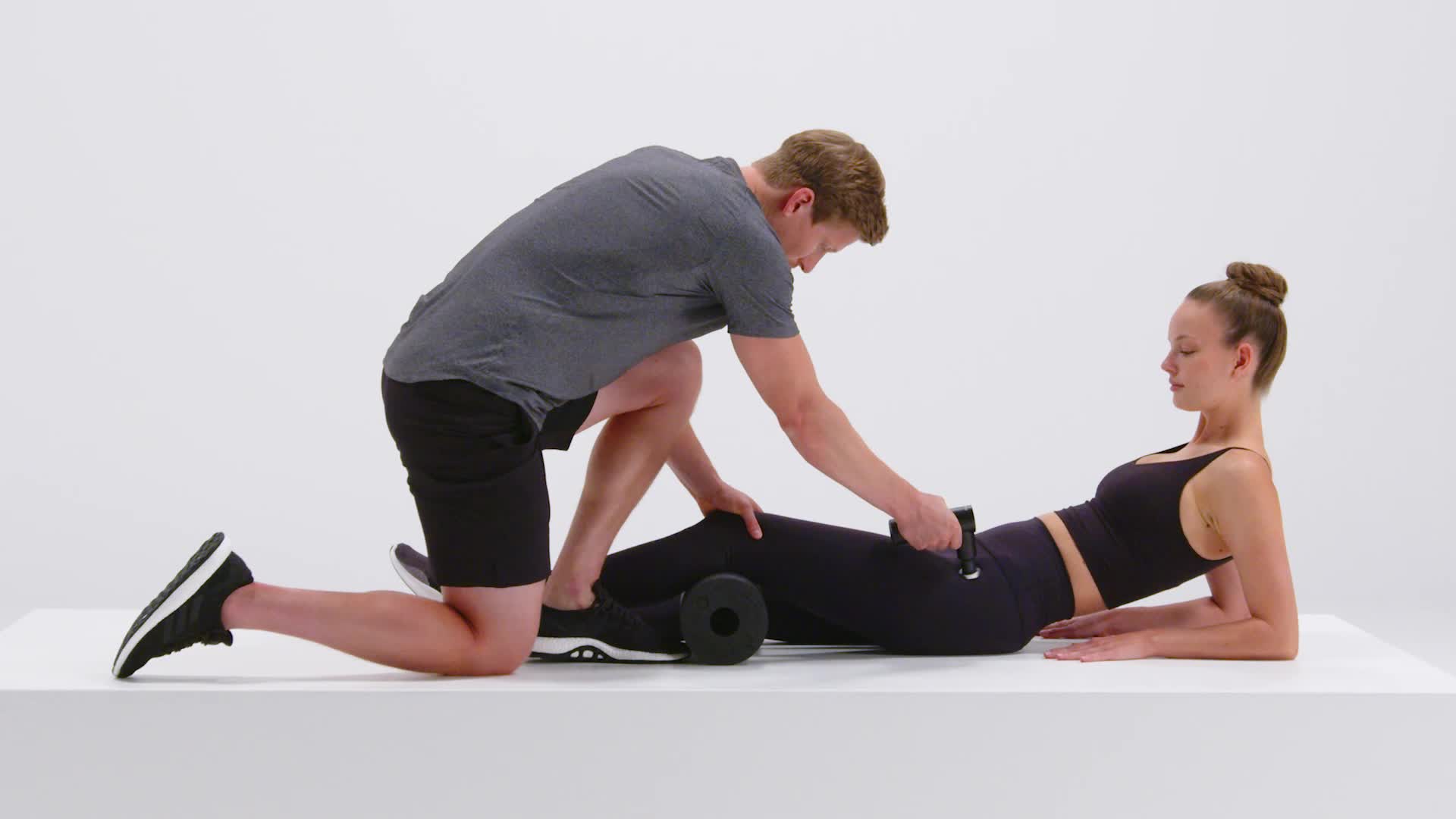 Begin in rugligging. Leg een BLACKROLL of een ander voorwerp onder je knieën. Je partner bewerkt de spieren van je buitenste dij van de knie tot de heup.
