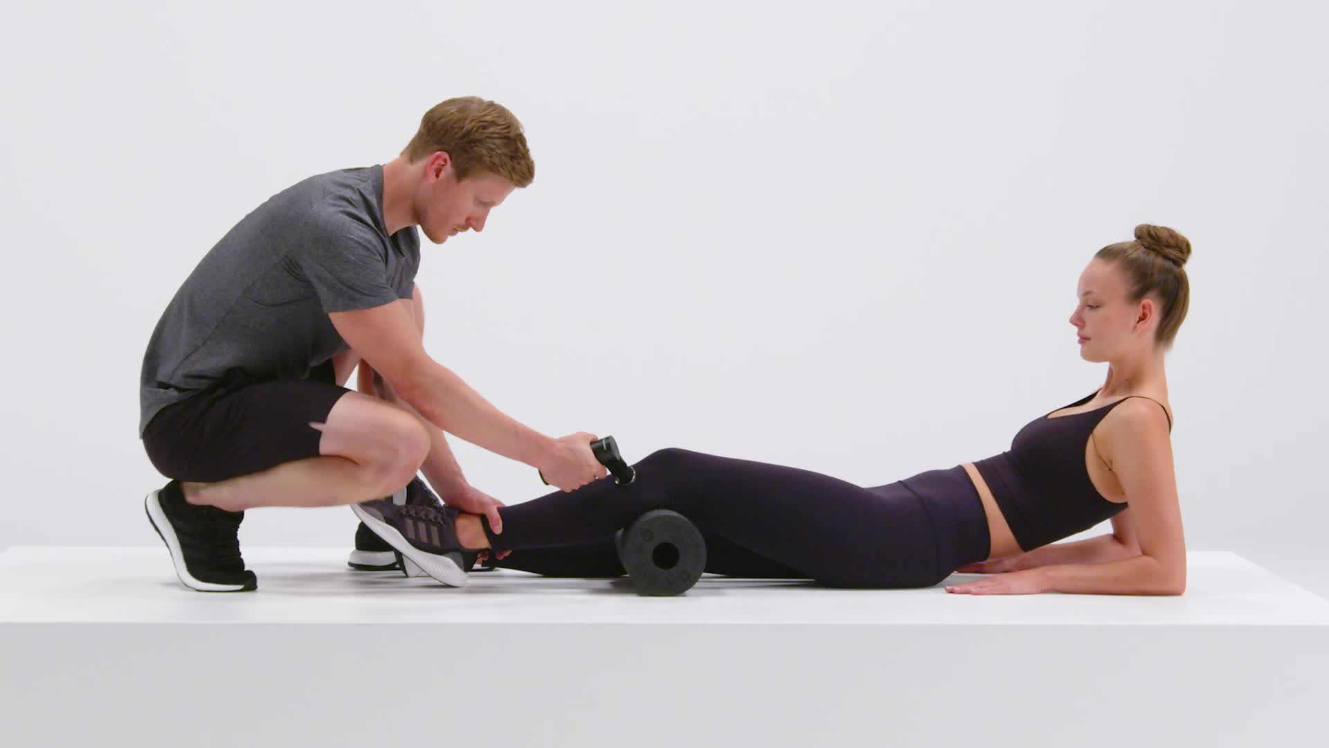 Begin in rugligging. Leg een BLACKROLL of iets dergelijks onder je knie. Je partner bewerkt de spieren buiten je scheenbeen van de enkel tot de knie.