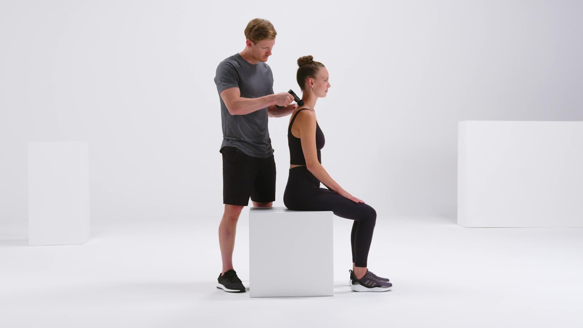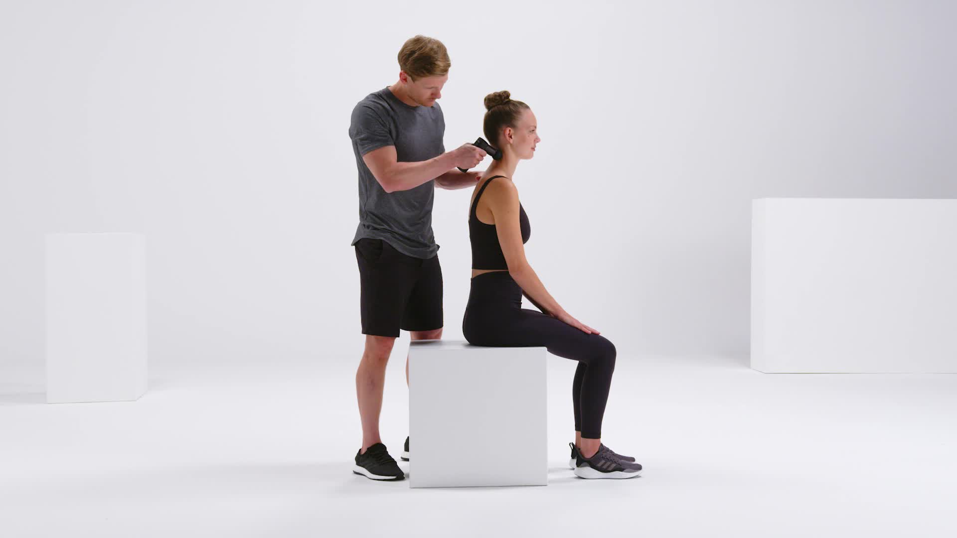 Begin in een zittende houding. Je partner masseert het nekgebied vanaf de schouder naar de halswervelkolom. Het pistool mag alleen op de zachte weefsels gebruikt worden. Laat de halswervelkolom altijd weg. Deze oefening kan ook liggend gedaan worden.