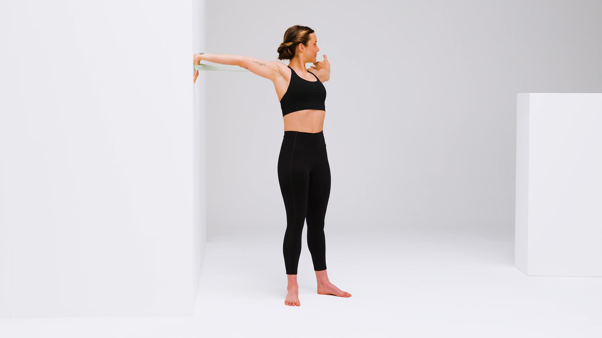 Plaats je hand op een muur op ongeveer schouderhoogte met de vingertoppen naar beneden wijzend. De STRETCH BAND ligt in de palm van elke hand. Draai je bovenlichaam omhoog naar de tegenovergestelde kant. Ga naar de maximale borstopening.