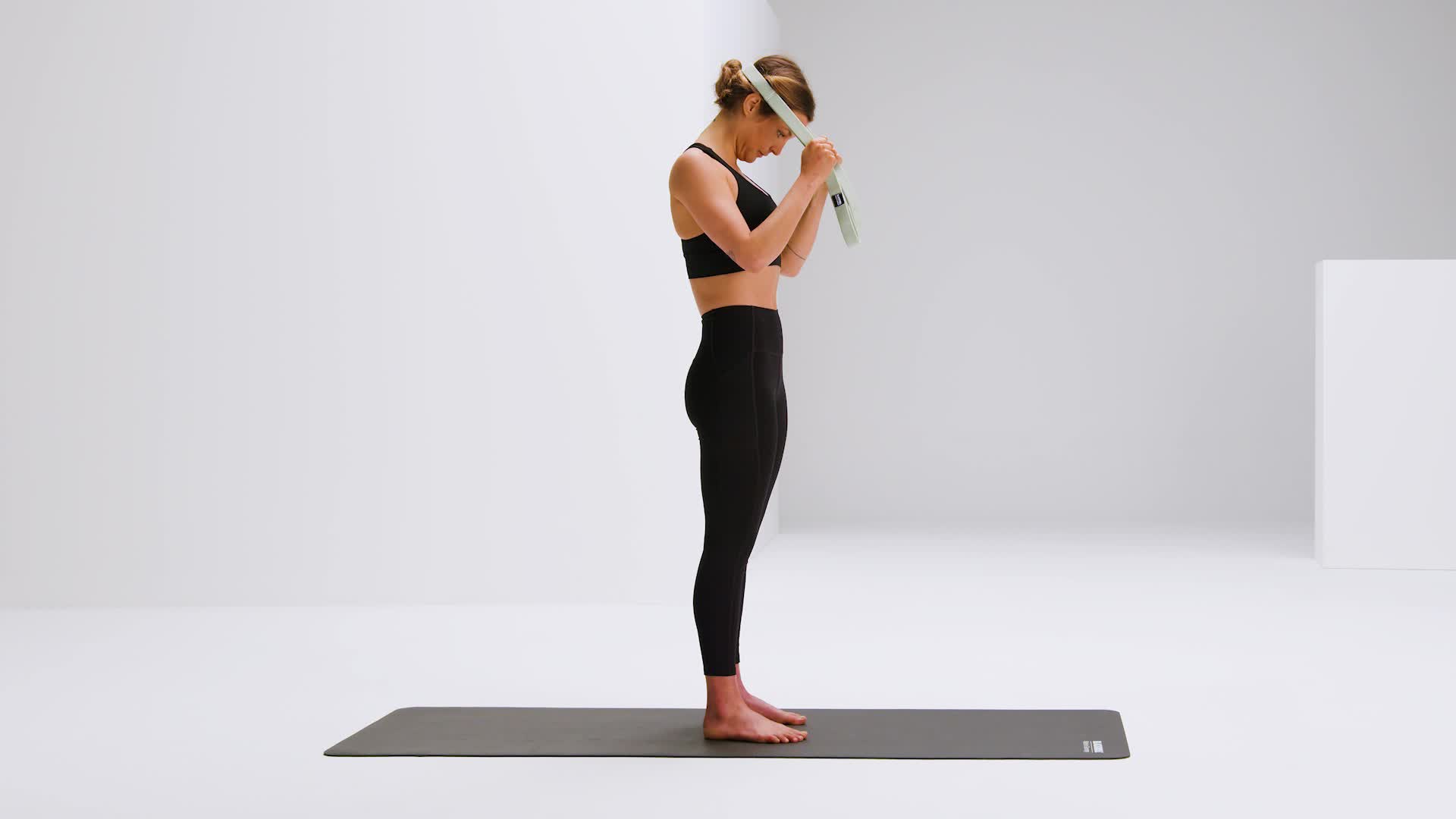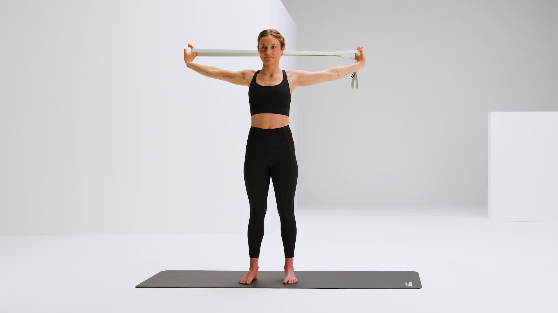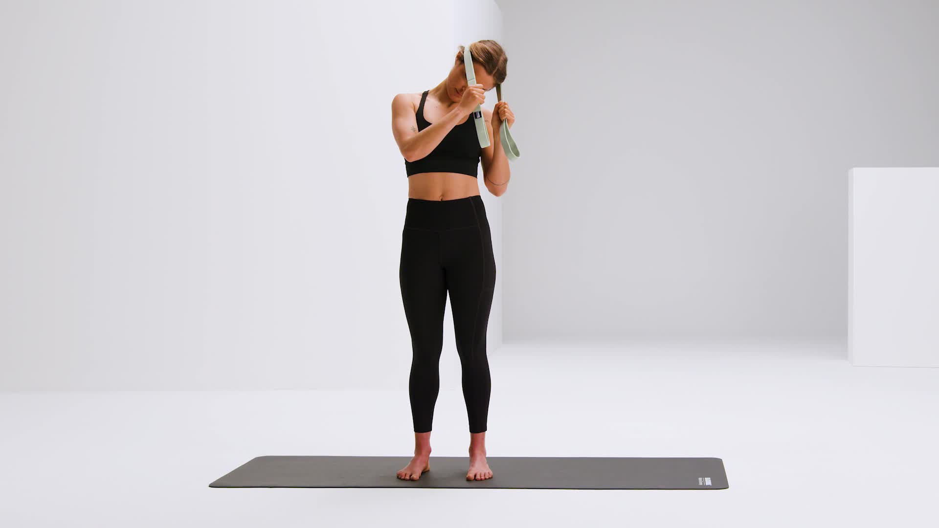 Grijp de STRETCH BAND vast met je vingertoppen. Steek je armen erdoor. Beweeg de band terug over je hoofd tot hij op gelijke hoogte is met je achterhoofd. Til je borstbeen naar boven. Houd de positie vast.