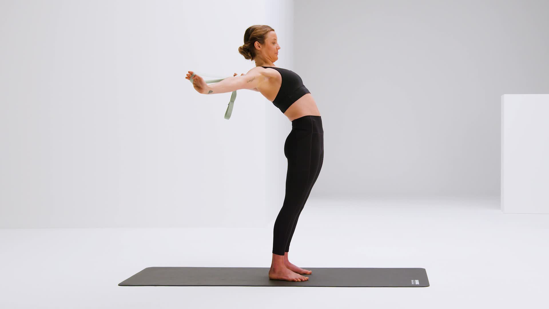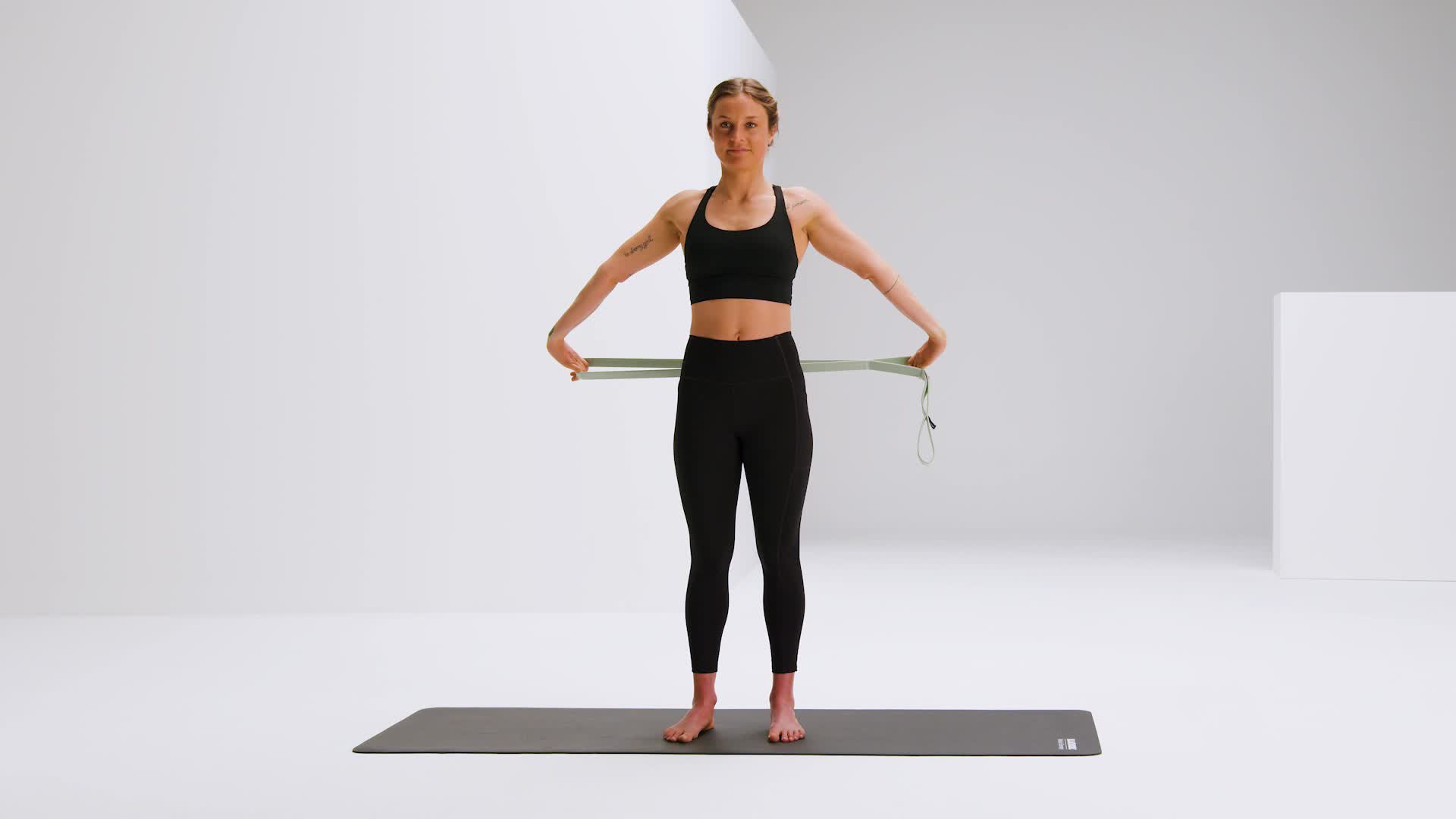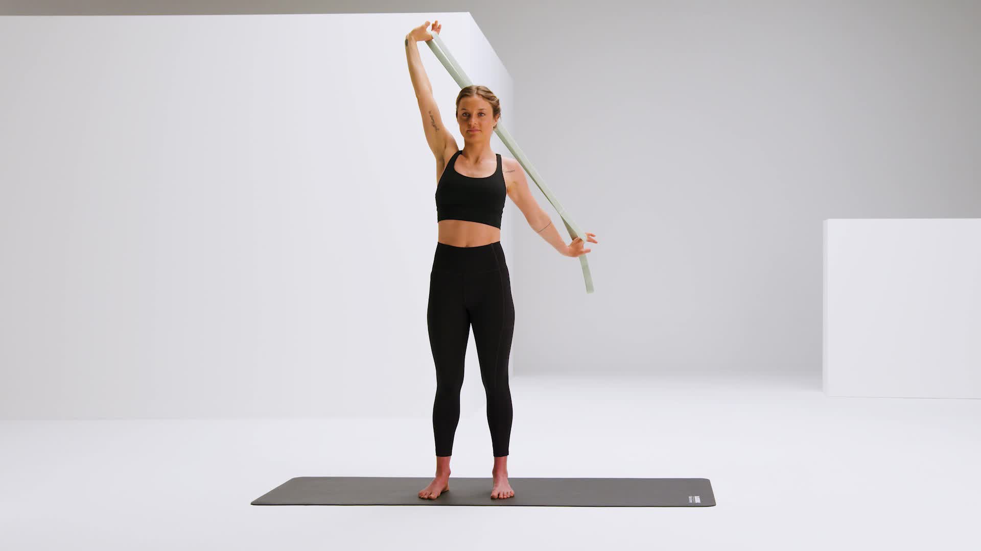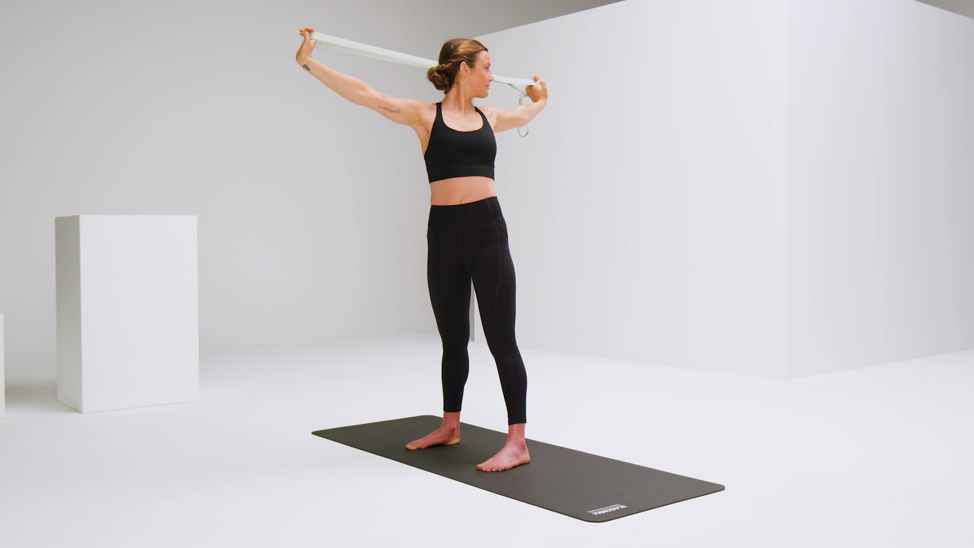 Grijp de STRETCH BAND vast met je vingertoppen. Steek je armen erdoor. Beweeg de band terug over je hoofd tot hij op gelijke hoogte is met je achterhoofd. Til je borstbeen naar boven. Houd de positie vast.