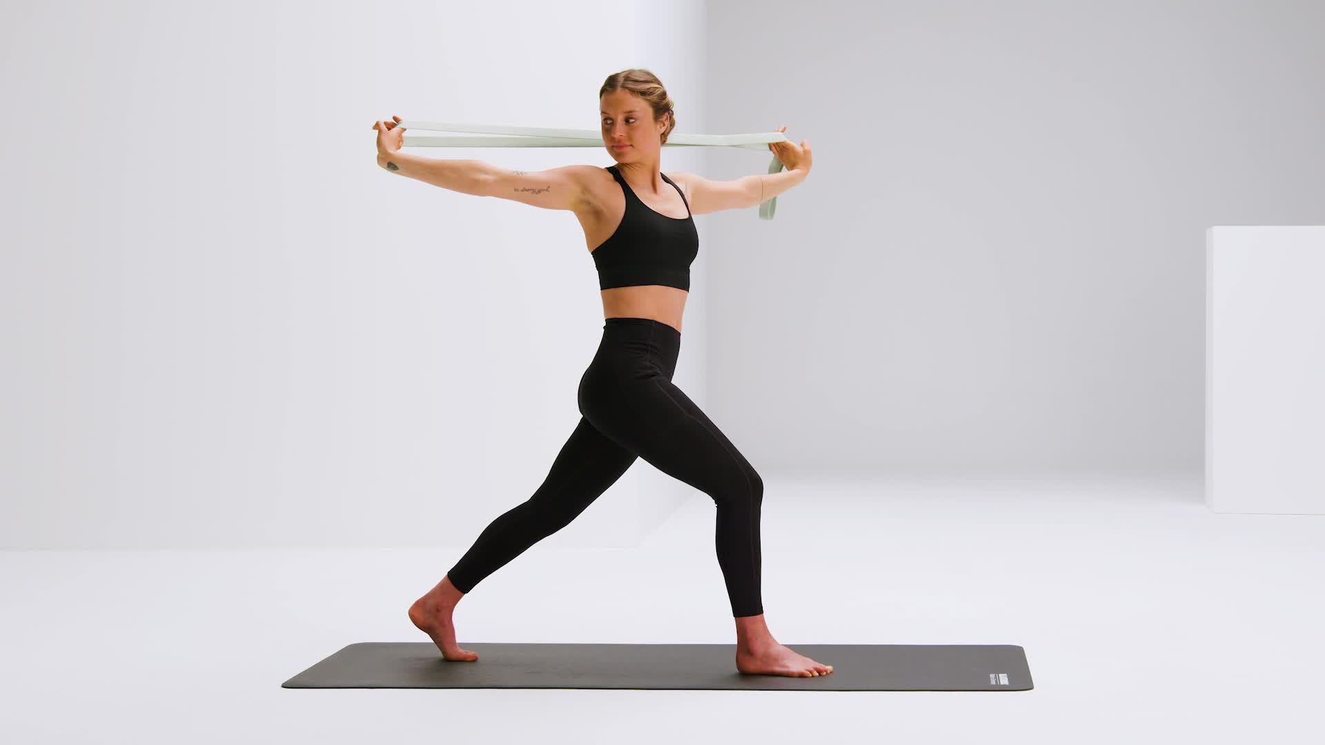 Kom in een lunge houding. Pak de STRETCH BAND vast met je vingertoppen en breng hem achter je hoofd. Draai je bovenlichaam naar de tegenovergestelde kant van het achterste been. Je blik volgt je hand.