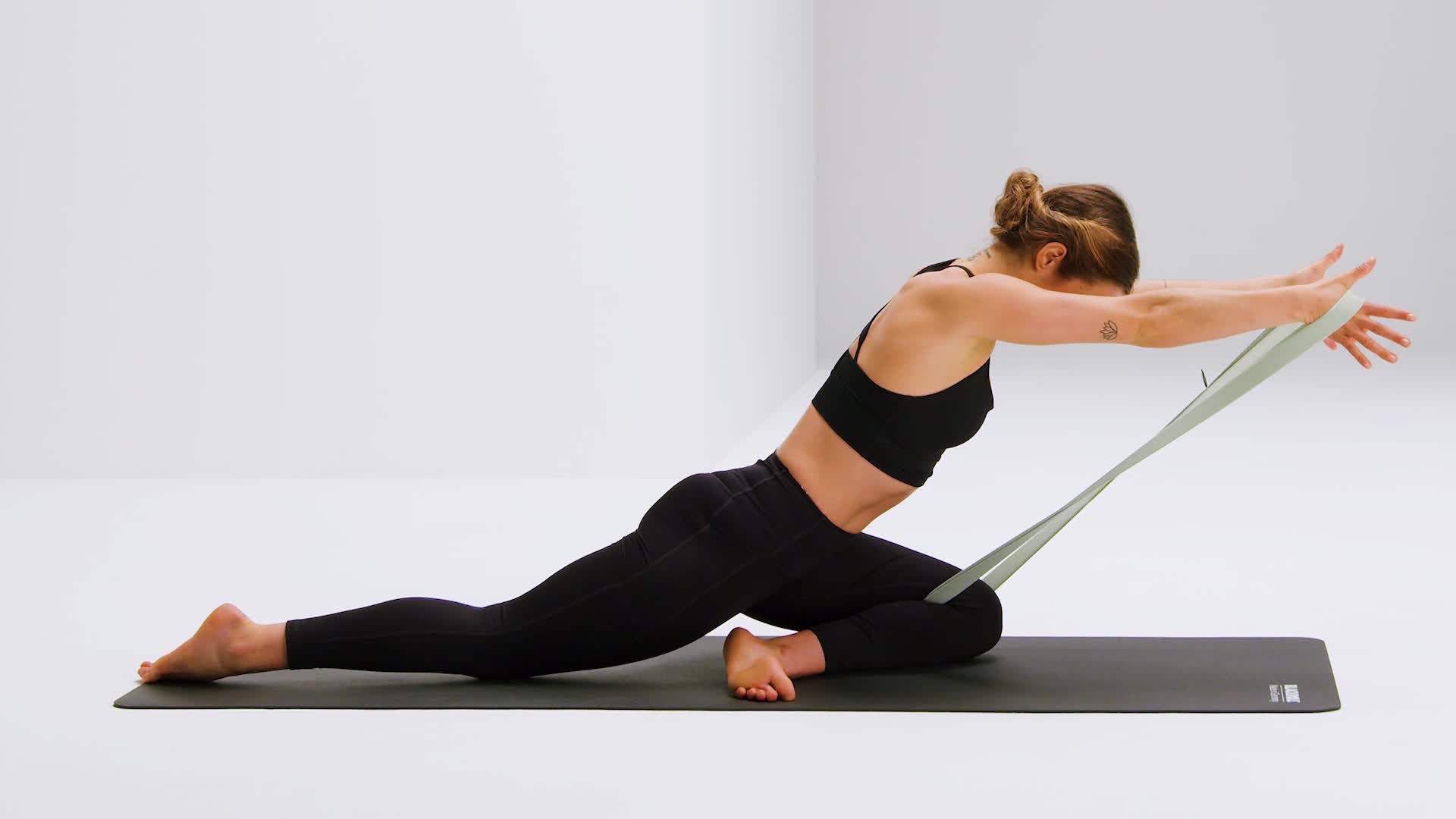 Grijp de STRETCH BAND met je vingertoppen en plaats hem achter je billen. Breng de band achter je omhoog. Houd de positie vast.