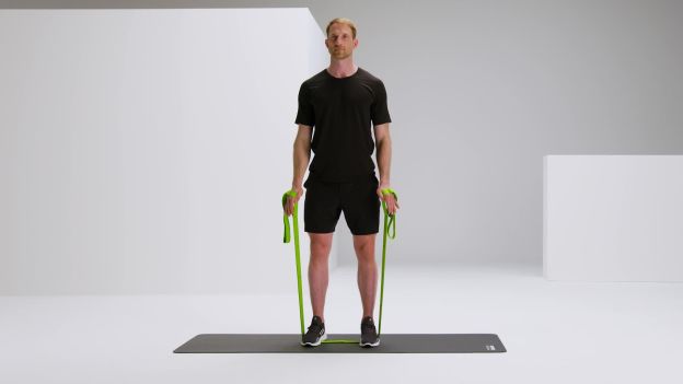 Stand in het midden op de MULTI BAND. Pak de lussen vast zoals gewenst. Hef je armen tot schouderhoogte.