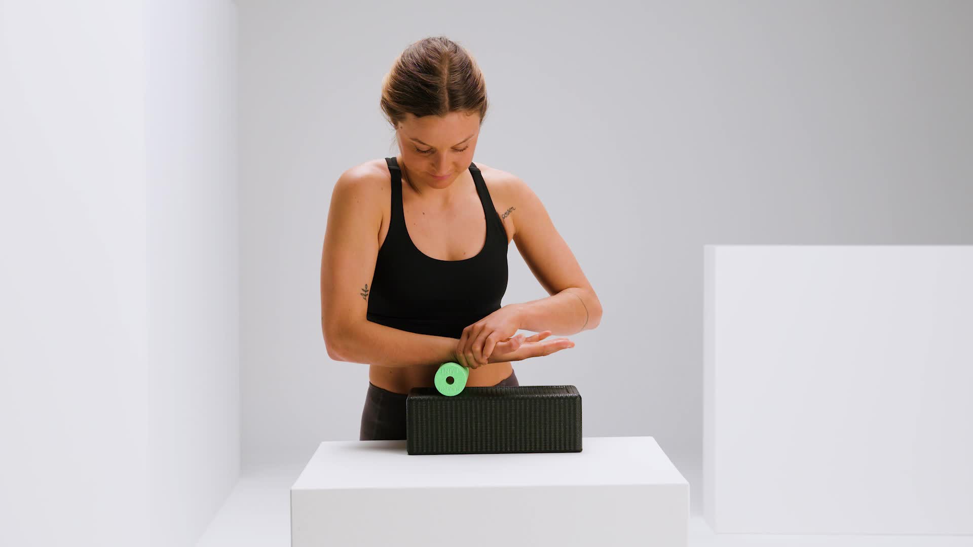 Leg de achterkant van de onderarm op de MINI en het BLOK. Rol achterwaarts en voorwaarts langs de onderarm.