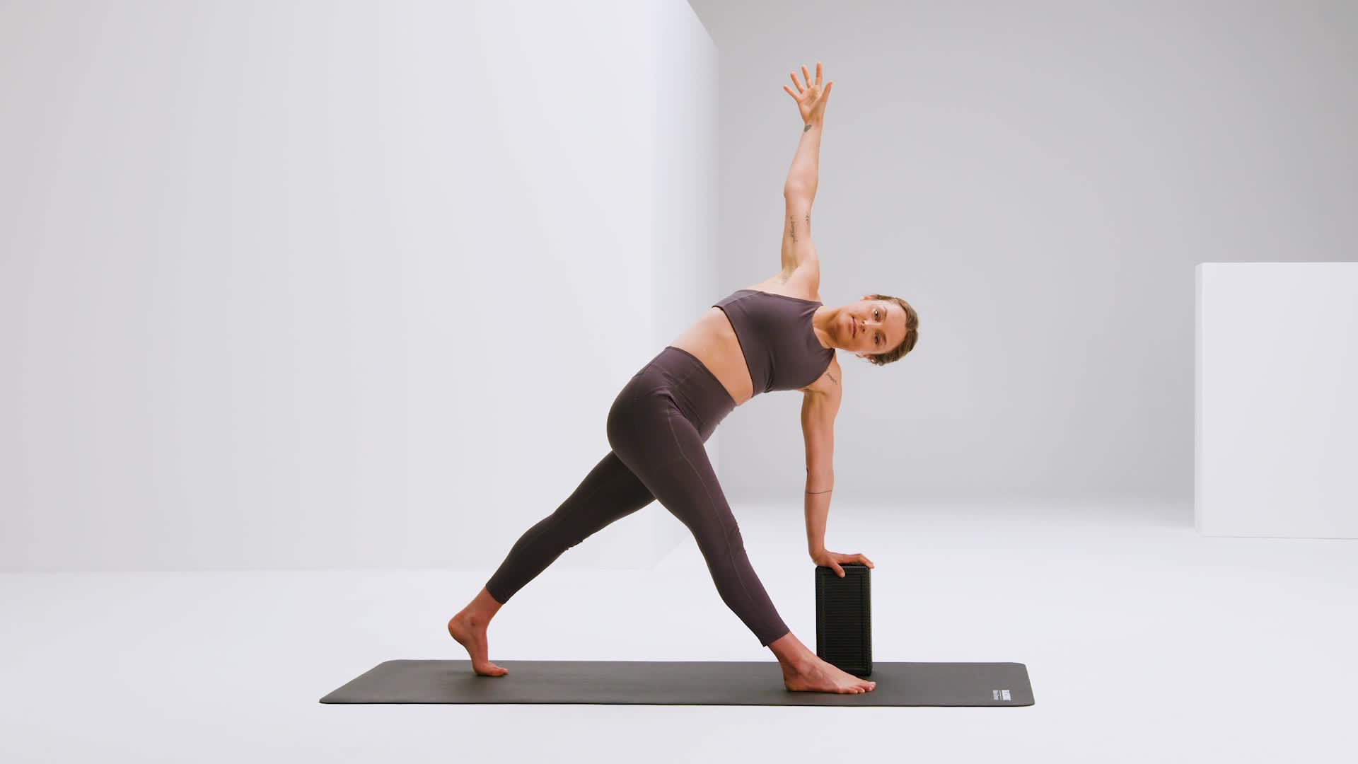 Neem een wijde lunge houding aan. Draai het achterste been 45 graden naar buiten. Leg een BLOK op de buitenkant van je voorste been en laat de tegenovergestelde hand erop rusten. Draai je bovenlichaam naar het BLOK. Strek je vrije arm naar boven uit. Je blik volgt je hand.