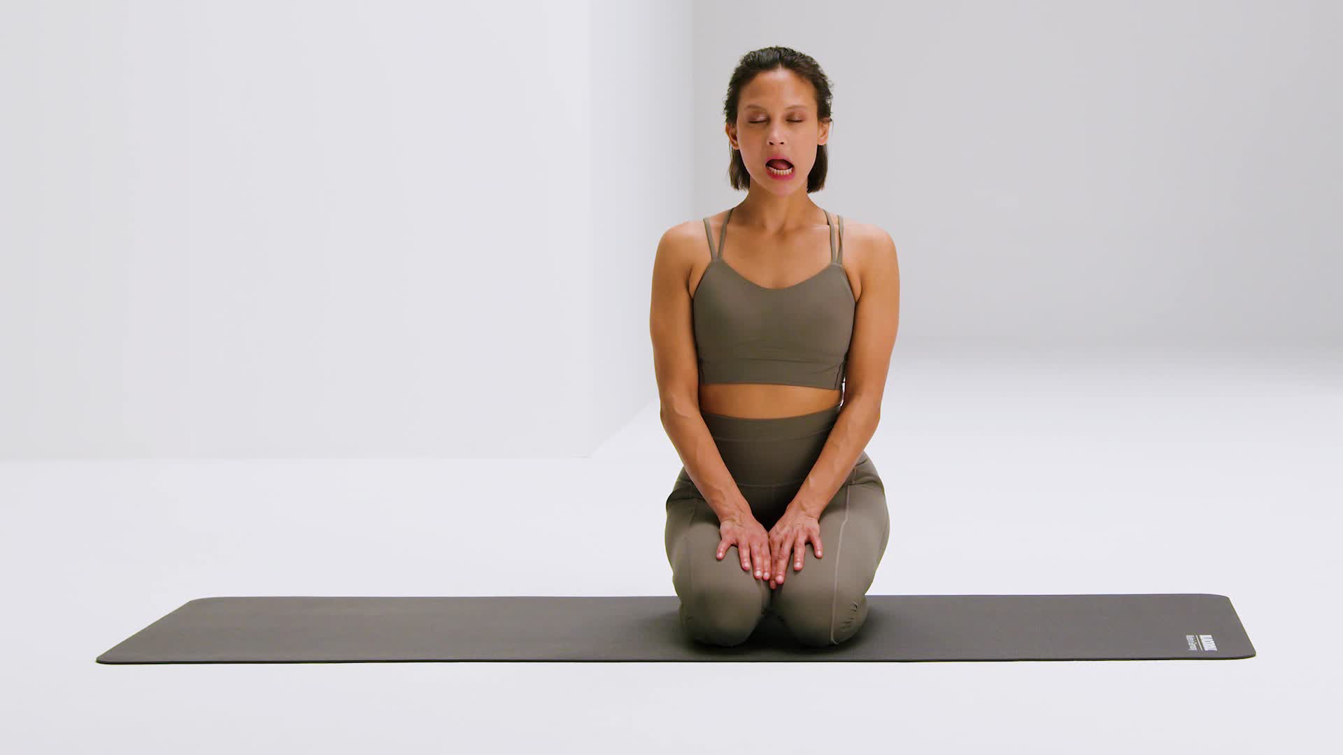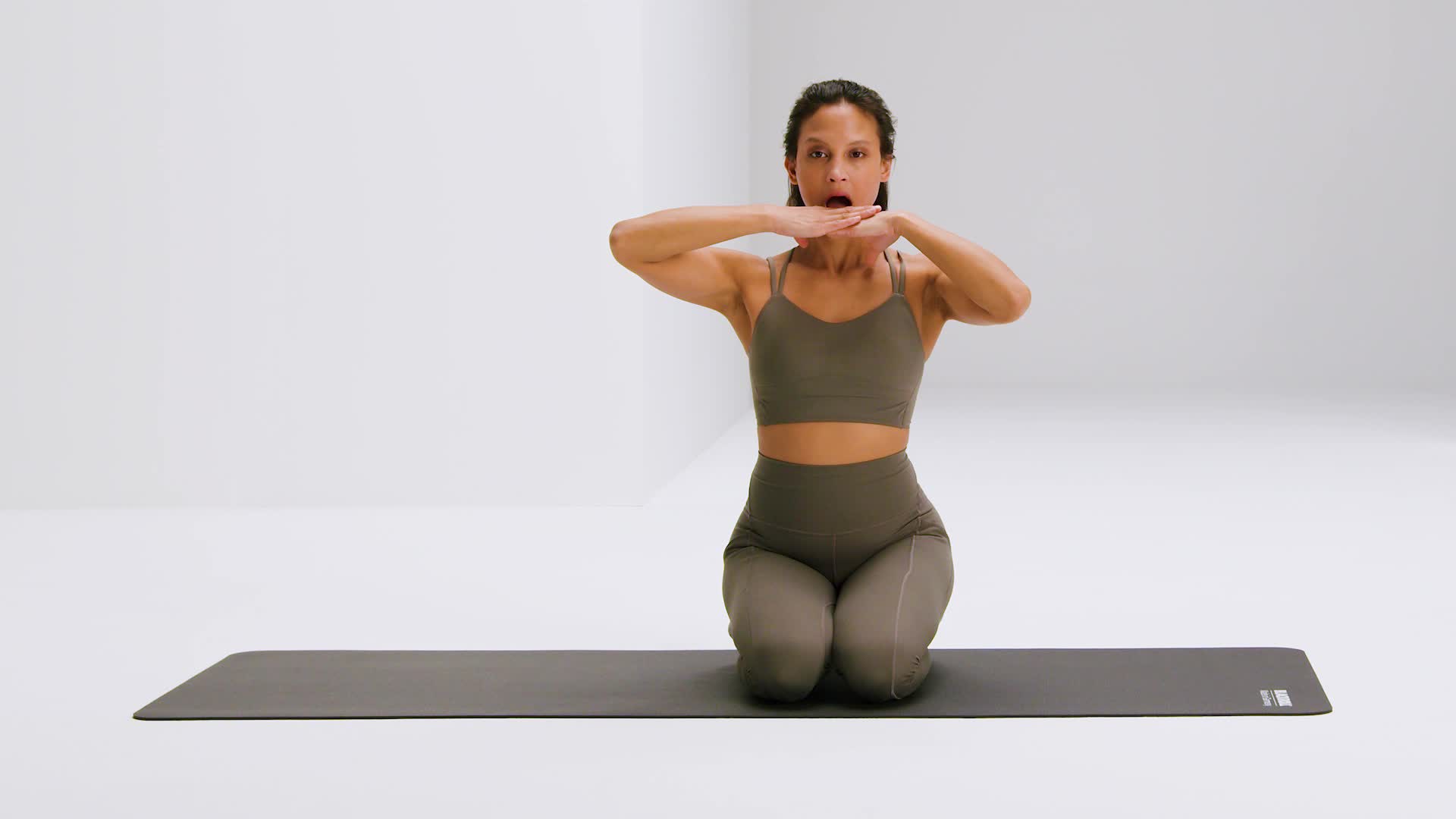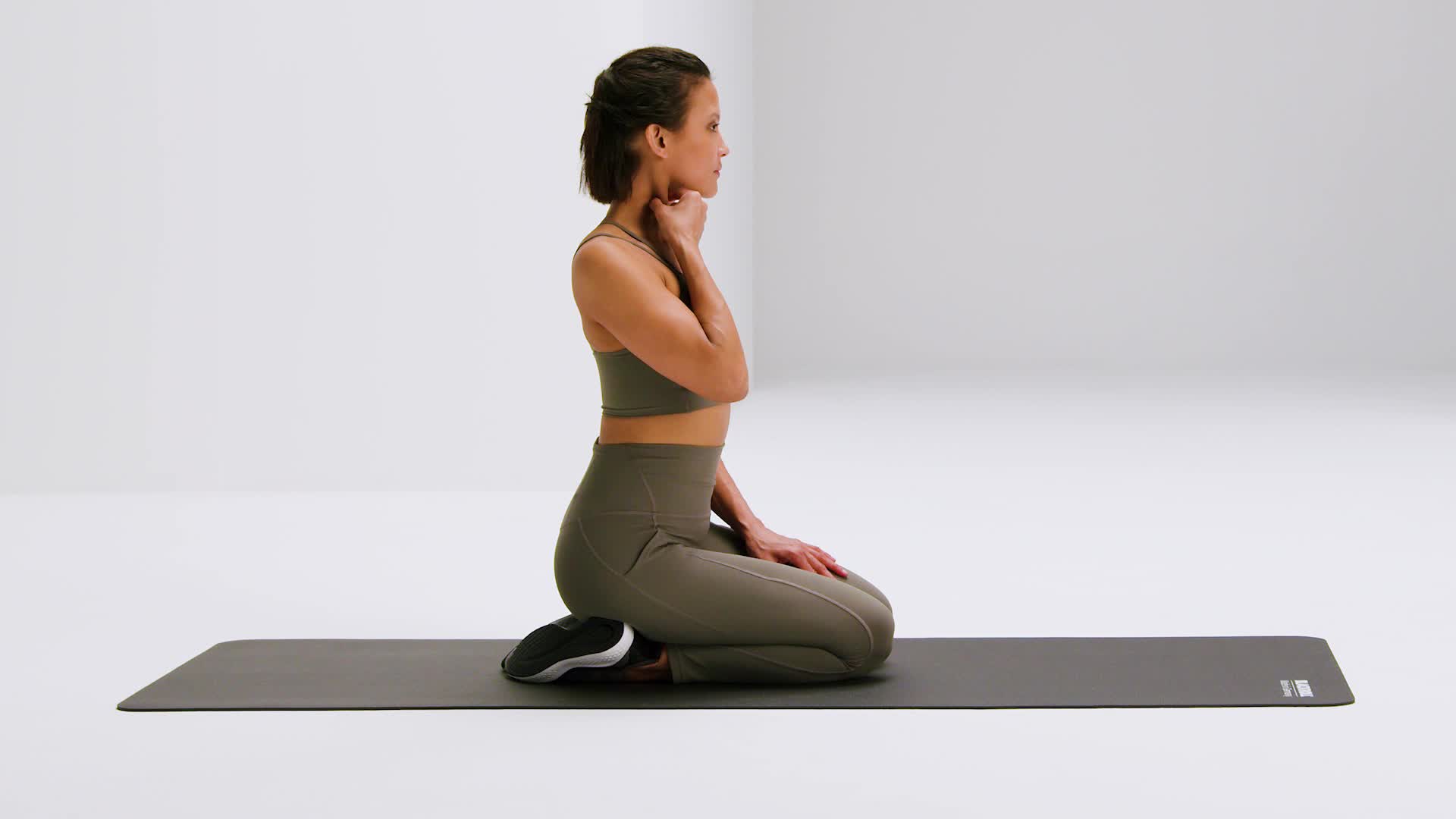 Leg een hand in je kinkuiltje. De andere hand leg je er direct overheen. Druk de onderkaak zo ver het gaat naar beneden en hou de rek een paar seconden aan.