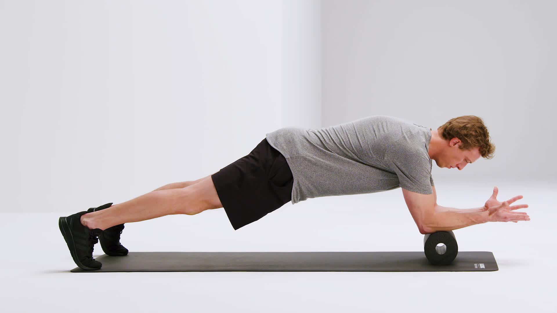 Kom in de onderarmsteun en plaats uw onderarmen op de BLACKROLL®. De palmen wijzen naar het plafond. De navel trekt naar de wervelkolom en het bekken kantelt iets naar voren.