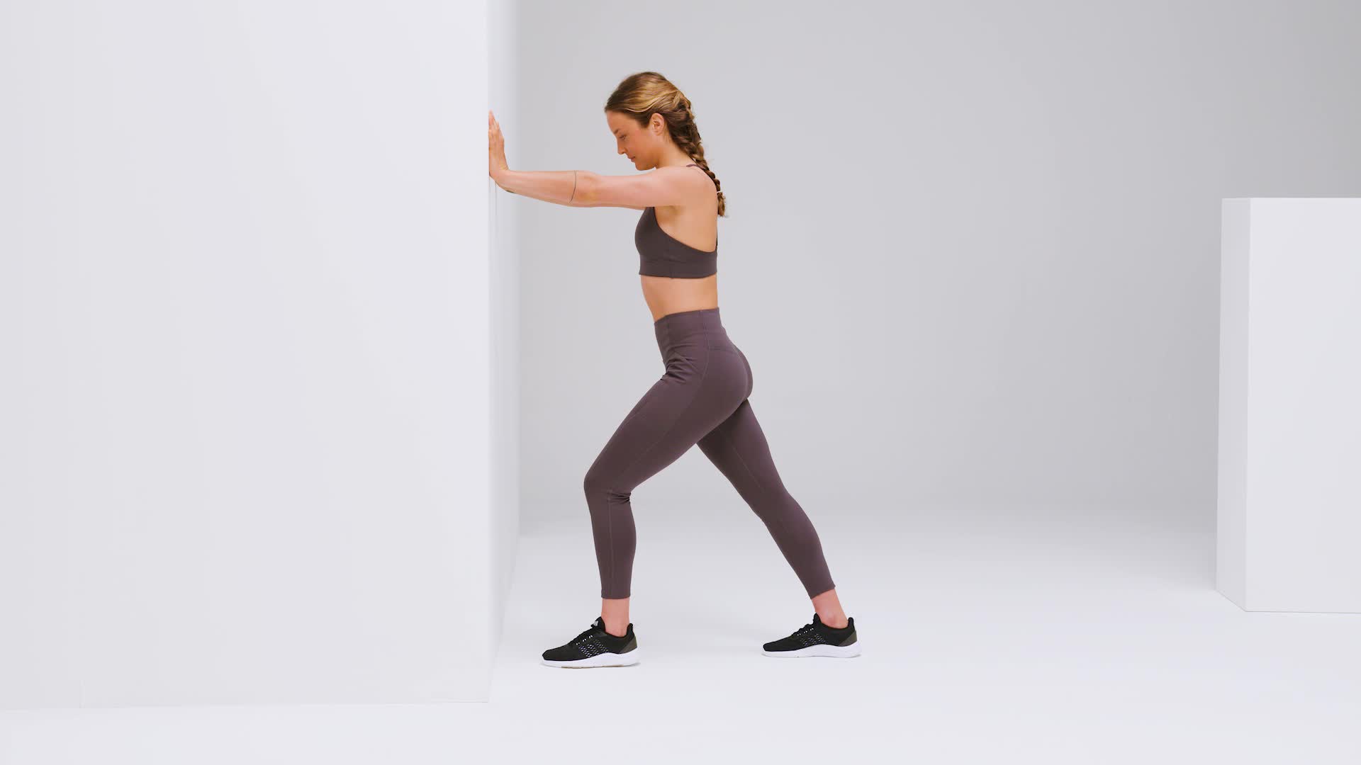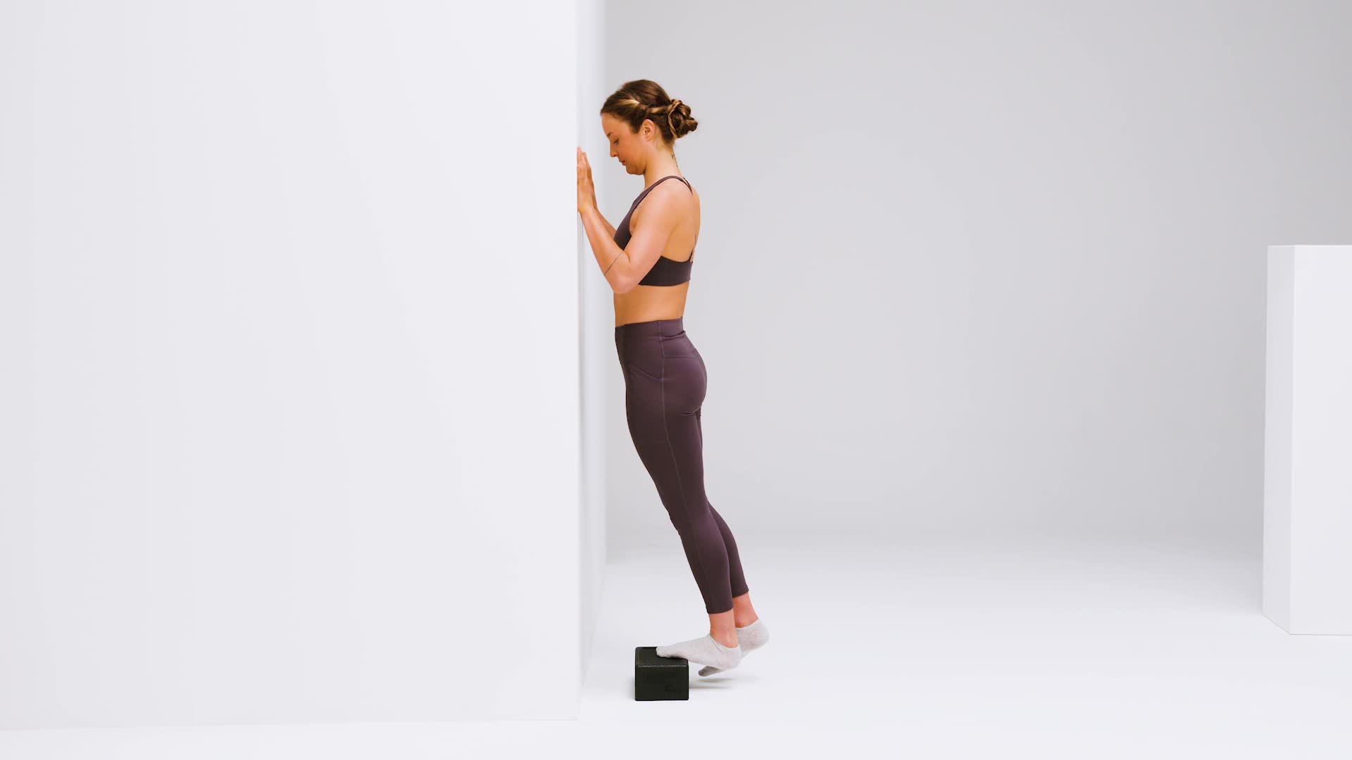Ga op één been op je tenen op de BLACKROLL® BLOCK voor een muur staan, zodat je hiel vrij in de lucht hangt en je met je handen tegen de muur kan leunen.
