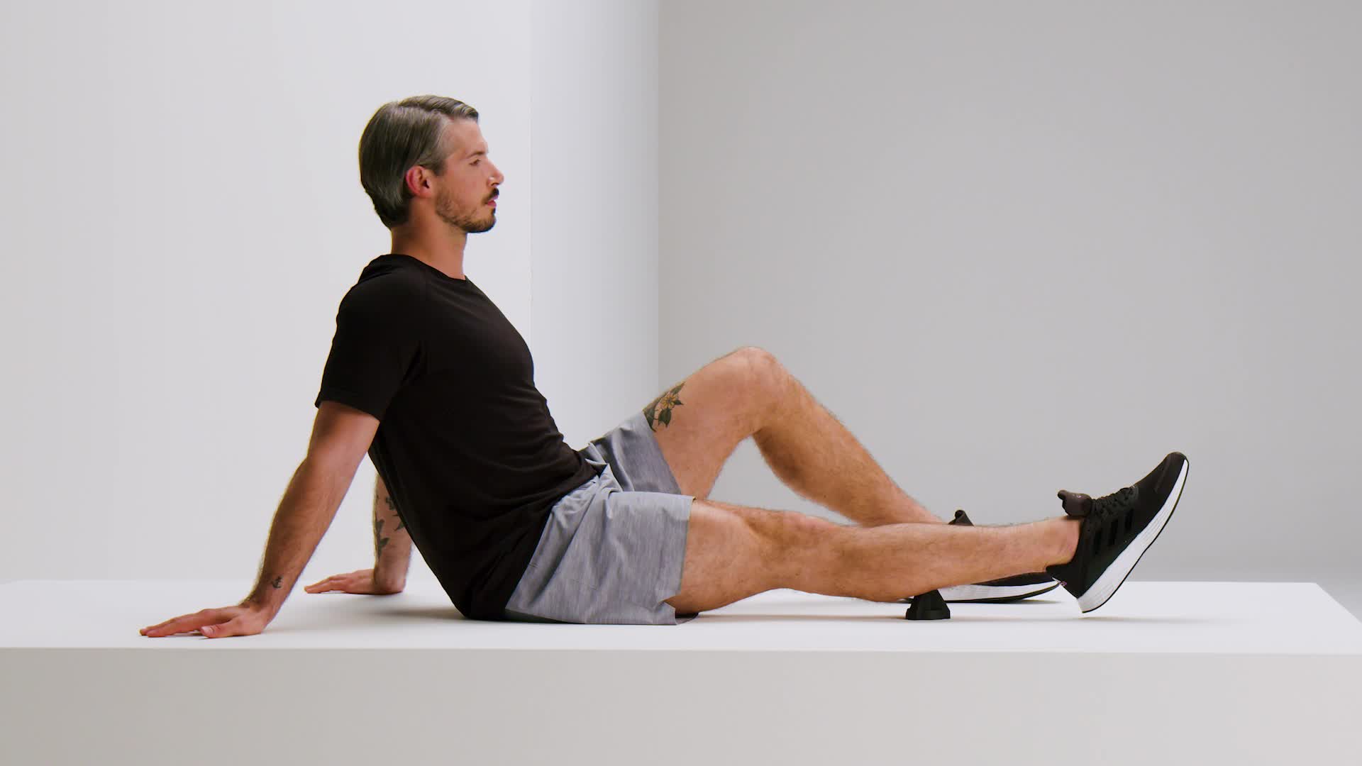 Ga met gestrekte benen zitten en leg je kuit op de BLACKROLL® of TWIN, zodat deze zich in het midden van je onderbeen bevindt.