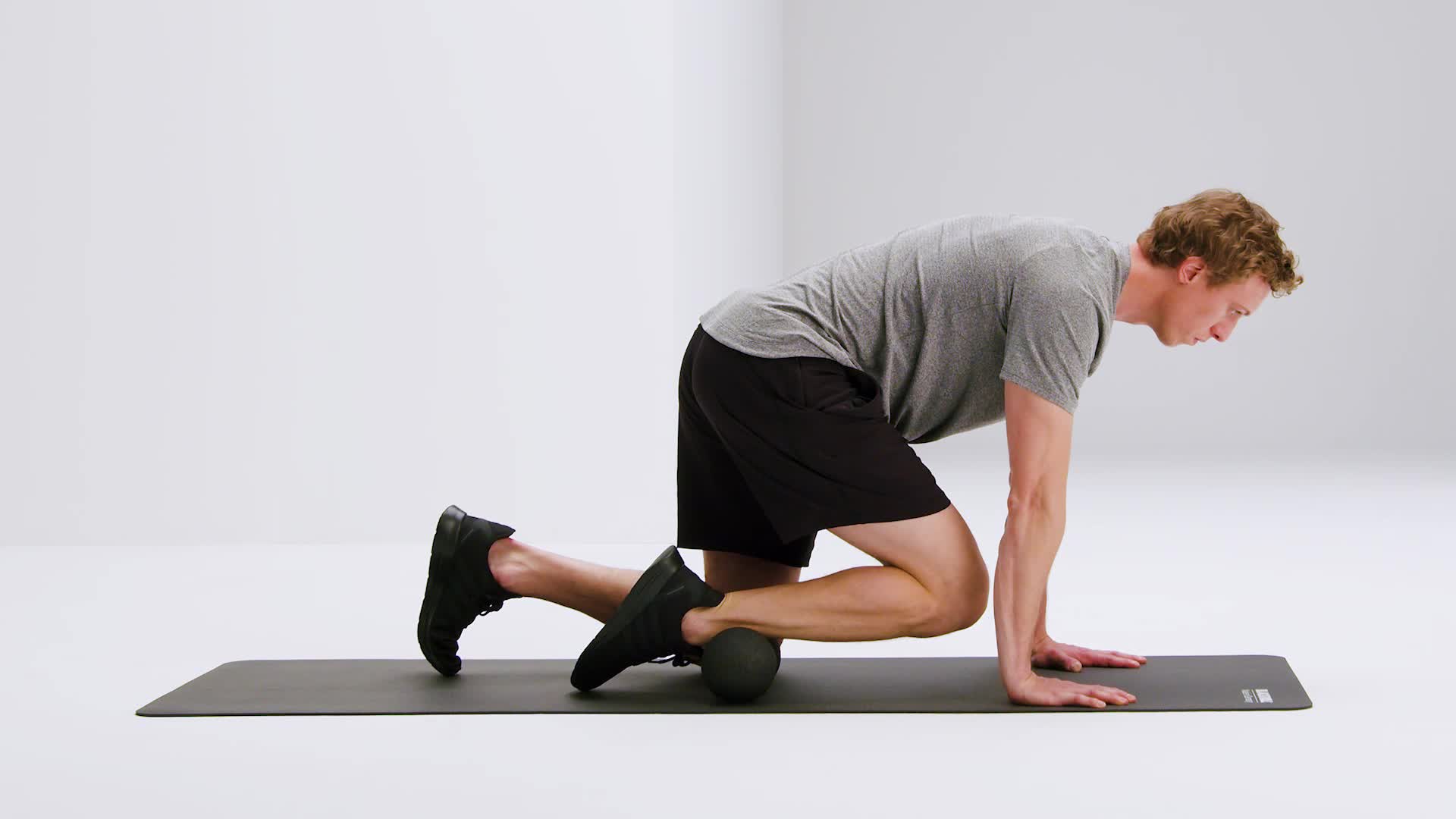 Start in viervoetige positie (polsen onder de schouder en knieën onder de heupen). Armen zijn licht gebogen. Hef de knieën van de vloer en plaats de DUOBALL onder jouw schenen.