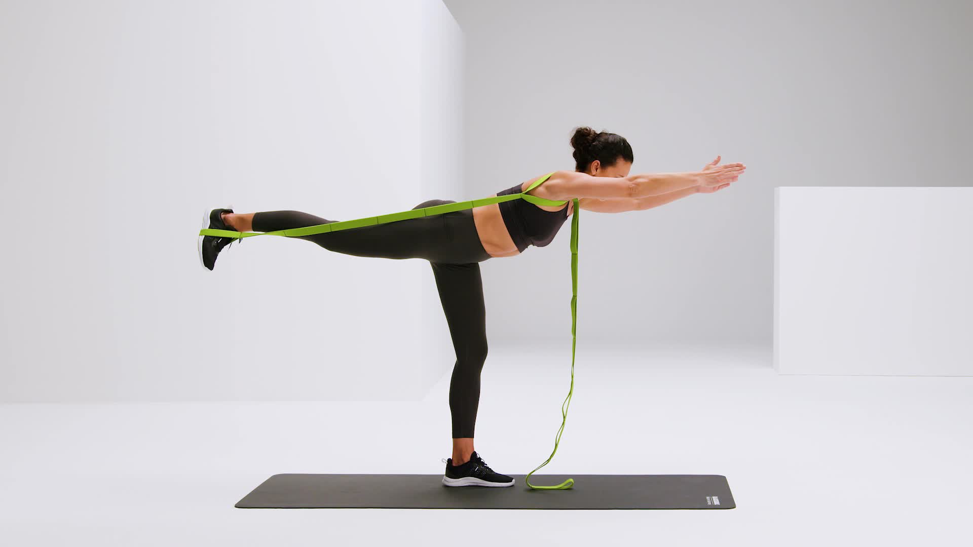 Stel in een houding op heupbreedte. Leg de MULTI BAND tegelijk om een voet en om de schouder. Buig je bovenlichaam naar voren en strek de band naar achteren in het been. Keer dan terug naar de beginpositie.